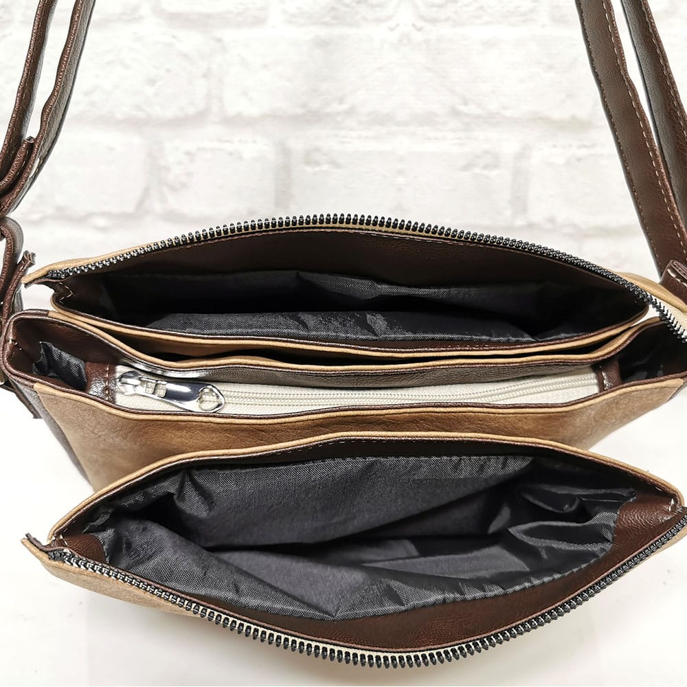 Отвътре: пет прегради, като една от тях се закопчава с цип, джобче за документи с цип, един джоб за телефон.