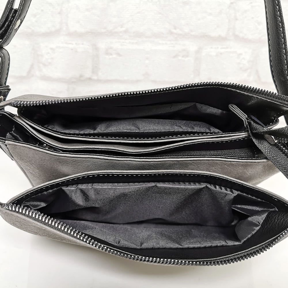 Отвътре: пет прегради, като една от тях се закопчава с цип, джобче за документи с цип, един джоб за телефон.