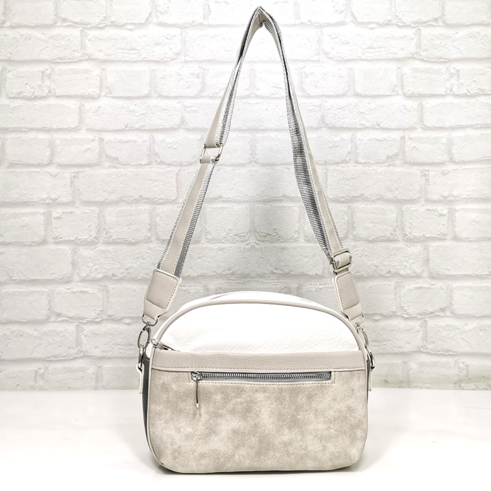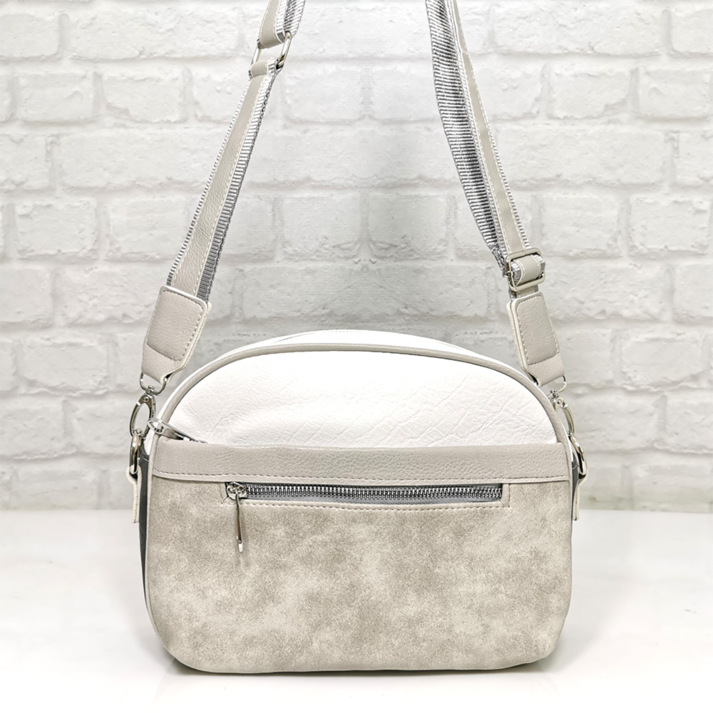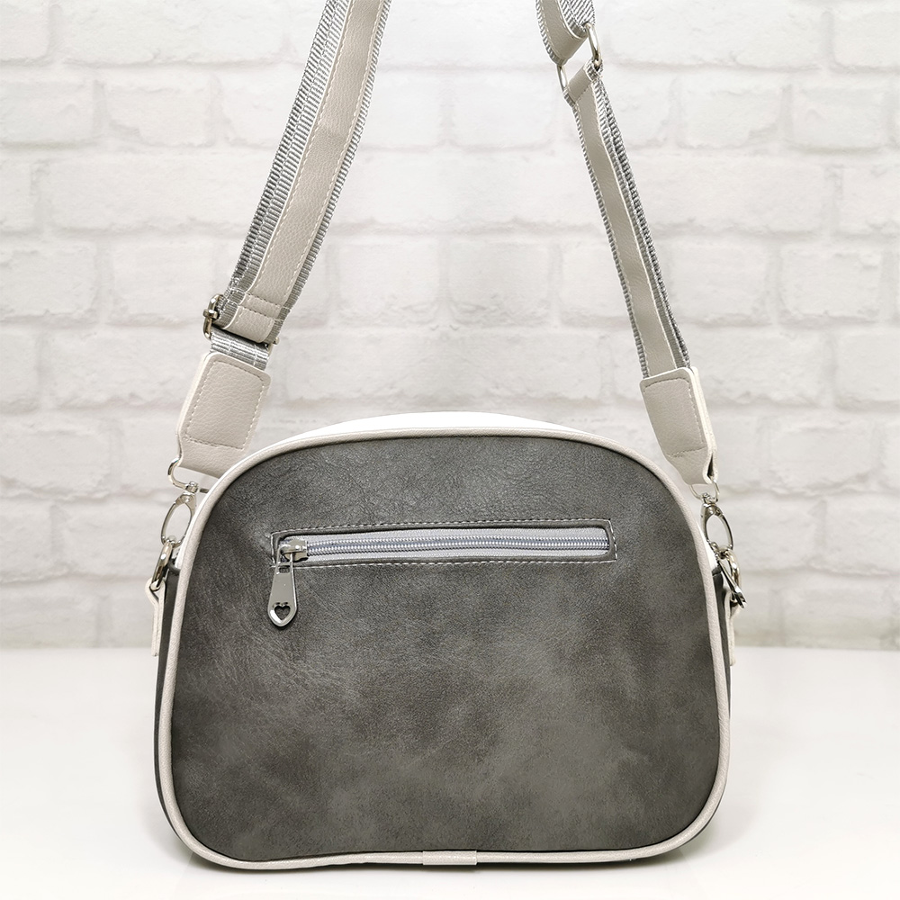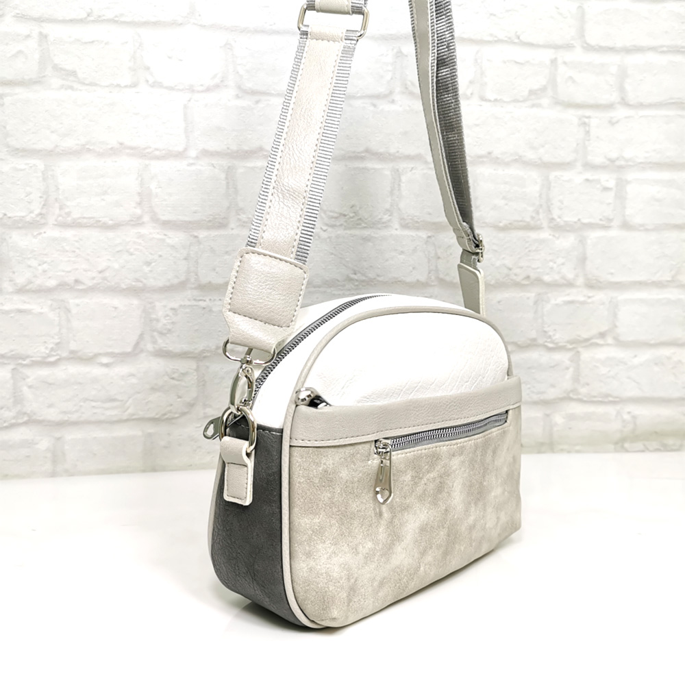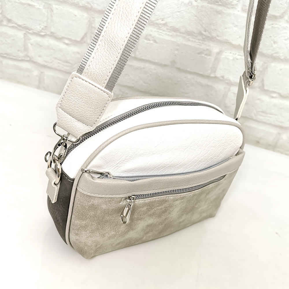 Стилна и удобна сива дамска чанта с елементи в бяло. Подходяща за ежедневна употреба, с регулируема широка дръжка и много джобчета за максимален комфорт и адаптивност към всяка визия. ПРИБЛИЗИТЕЛНИ РАЗМЕРИ Дължина на дъното: 25.5см. НАЧИН НА ЗАКОПЧАВАНЕ С метален цип. ПРЕГРАДИ И ДЖОБОВЕ Отвътре: малко джобче с цип, един джоб за телефон. Отвън: на гърба джоб с цип, отпред два джоба с ципове. ДРЪЖКИ Една сваляща се дълга регулираща се дръжка, комбинация от текстилна лента и еко кожа, с ширина 3.8см.. . МАТЕРИАЛ Еко кожа, хастар-полиестер, аксесоари от метал. ЦВЯТ Сива гама с бяло, обков метален сребрист. ПОДДРЪЖКА Да се почиства с мека и леко влажна кърпа, да се пази от остри предмети и органични разтворители! ПРОИЗХОД България