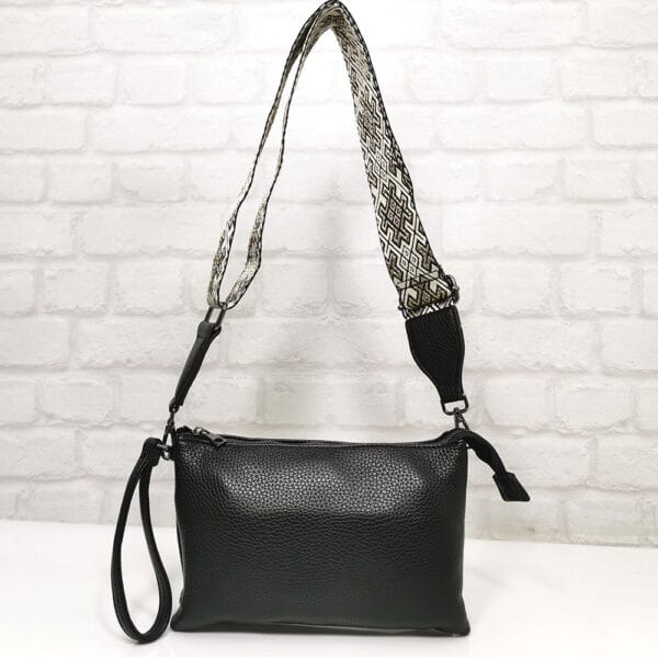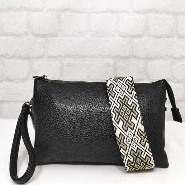 Чанта черен, дръжка комбинация от черен, бял и златист цвят, обков сребрист, матиран.