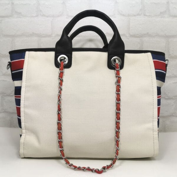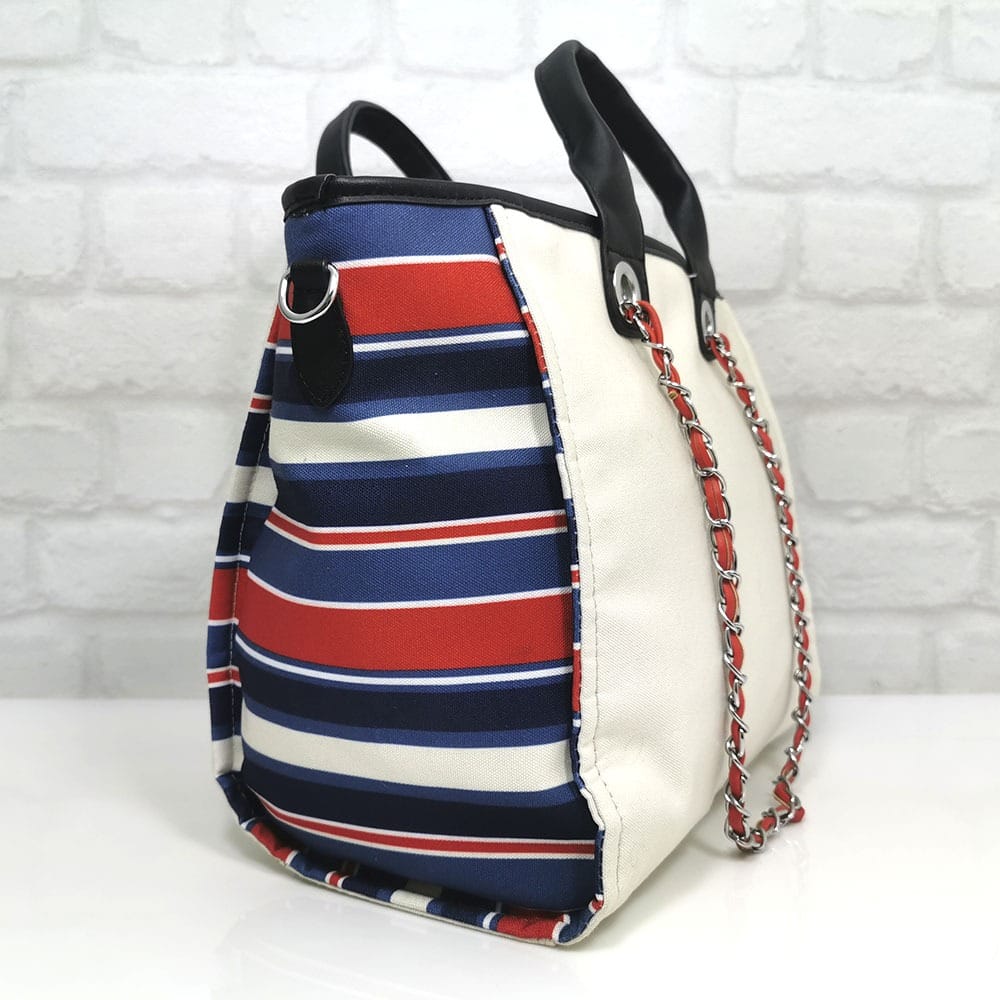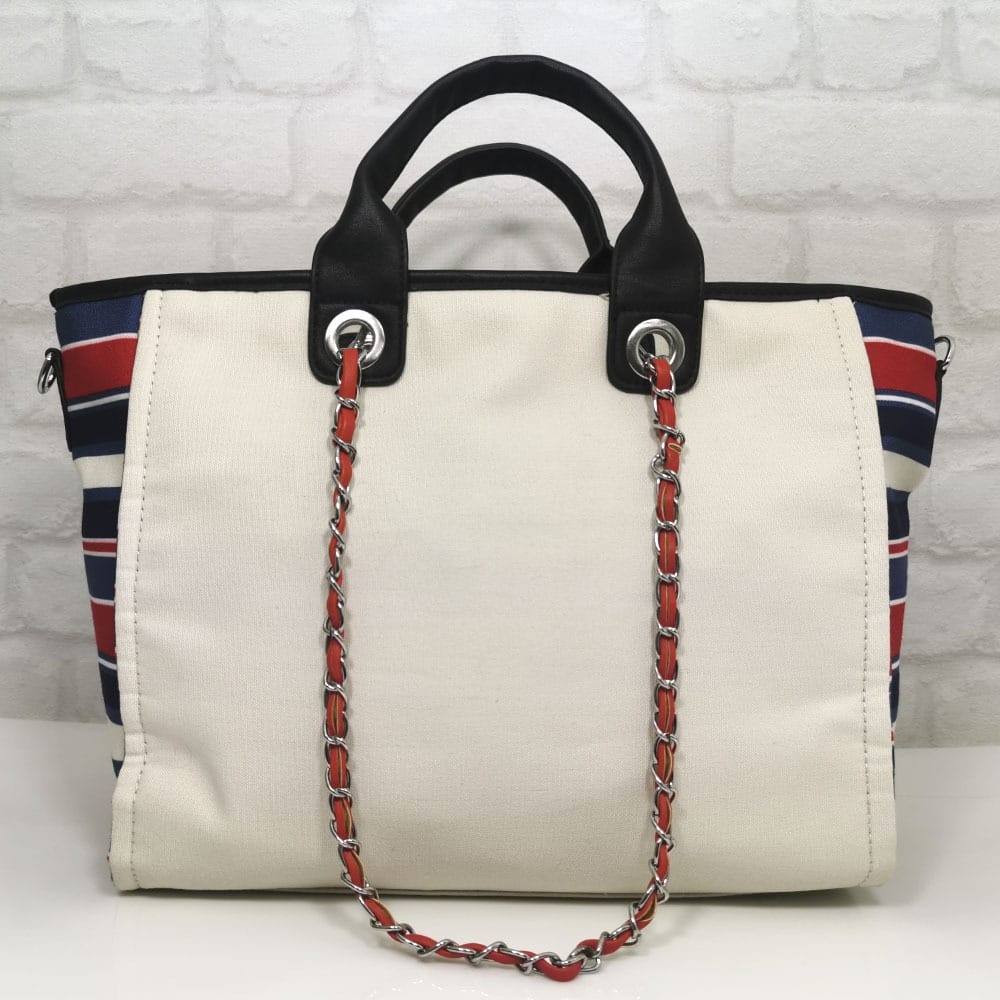 Основен екрю, комбиниран отстрани с ефектен лен различни цветова на раие, дръжки черни, обков сребрист