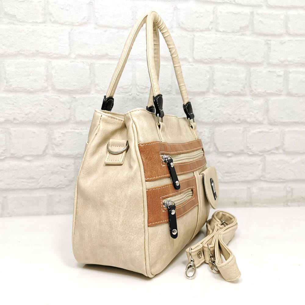 Отпред: Голям джоб с цип, малко джобче с капак затваря се с велкро, малко джобче без цип и още едно малко джобче с цип