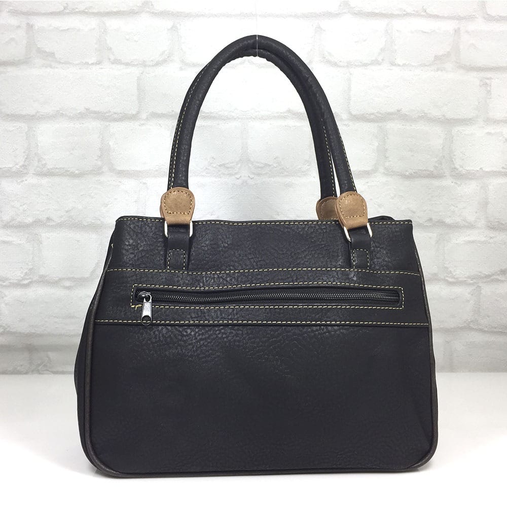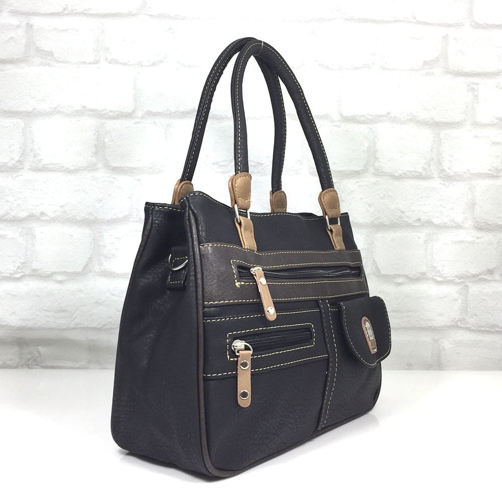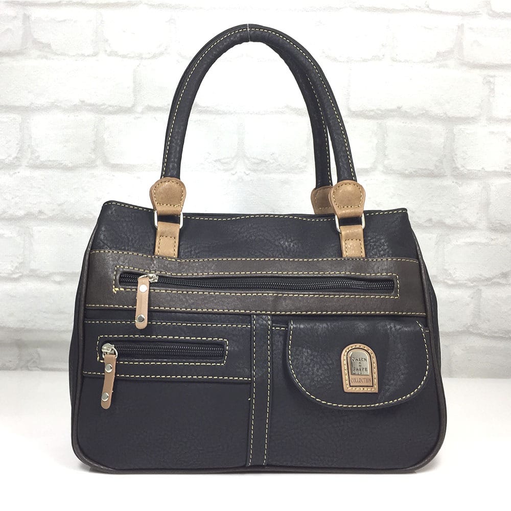 Основен цвят черен, гарниран с тъмно кафяво и малко бежово