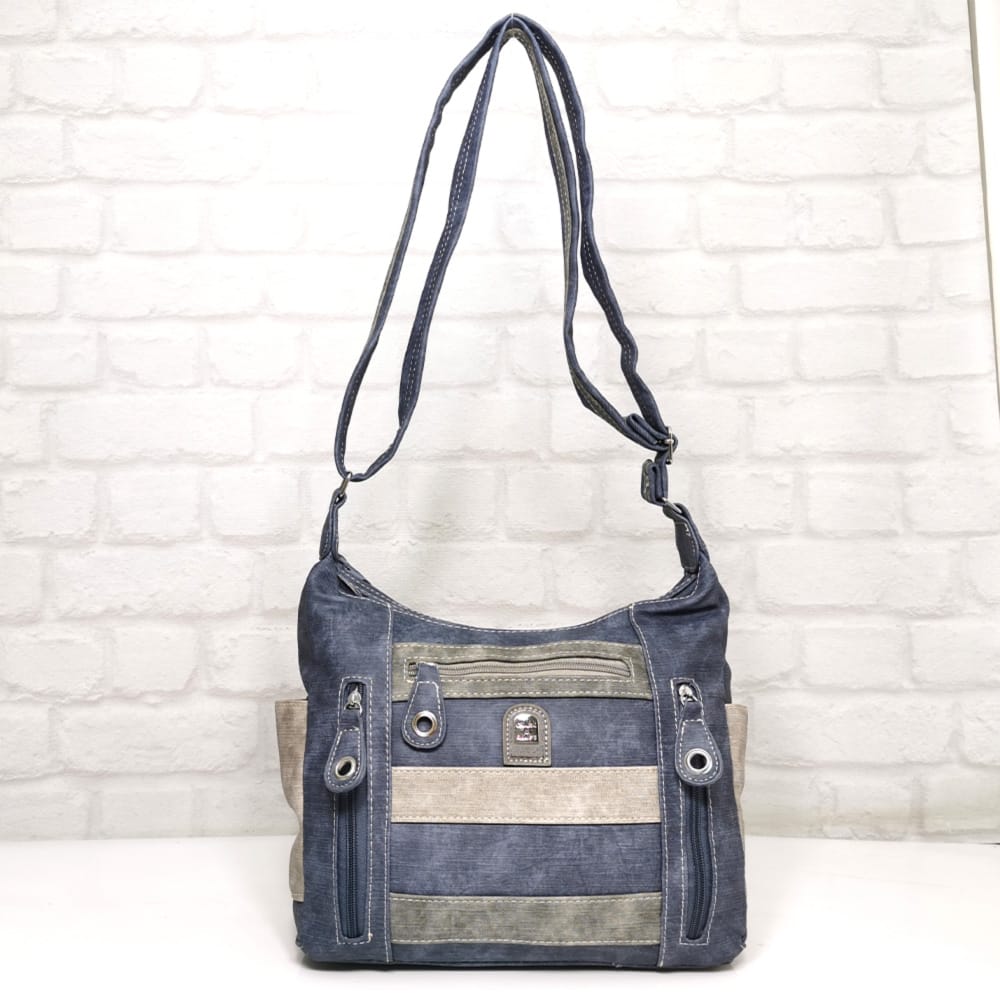 Основен цвят син, гарниран със сиво и малко екрю.