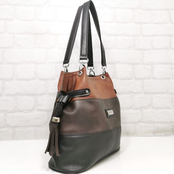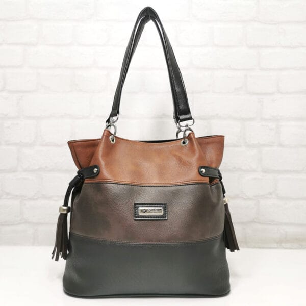 Комбинация от черно, тъмно кафяво и камел, обков сребрист.