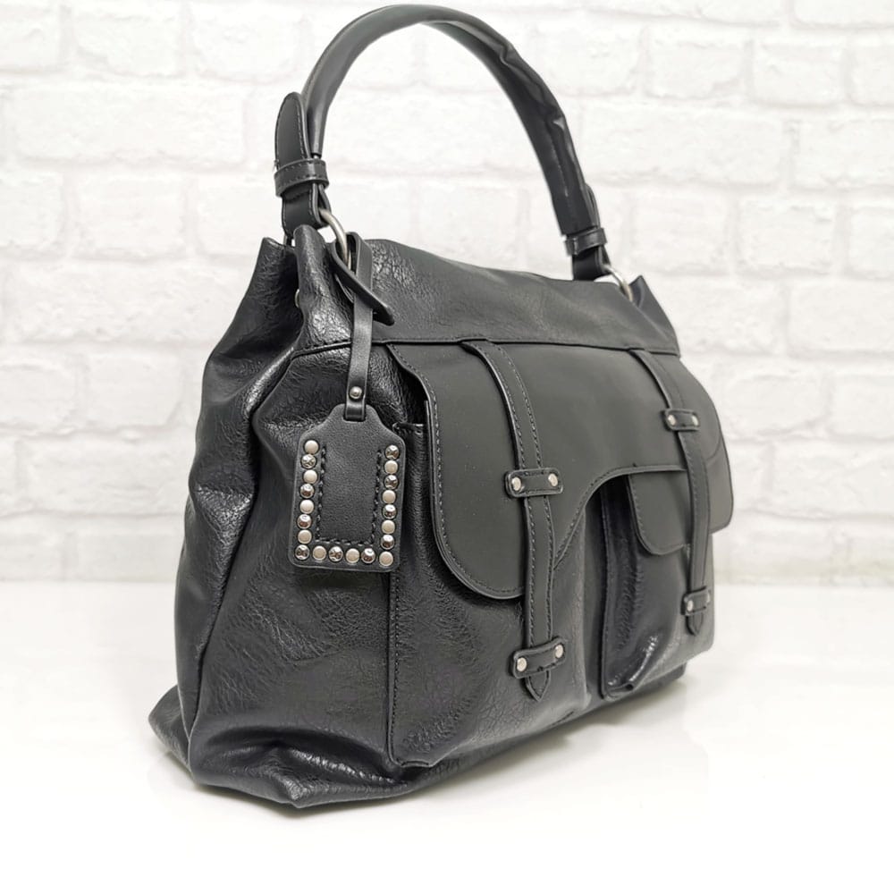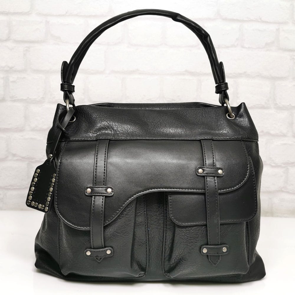 С цип и магнитно копче на един от предните джобове.