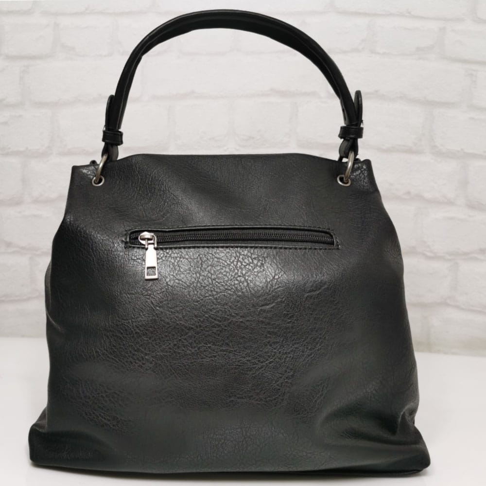 Отвън: на гърба джобче с цип, отпред два джоба-един без закопчаване и един с капак и магнитно копче.