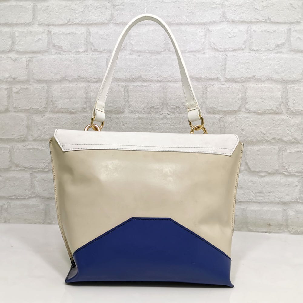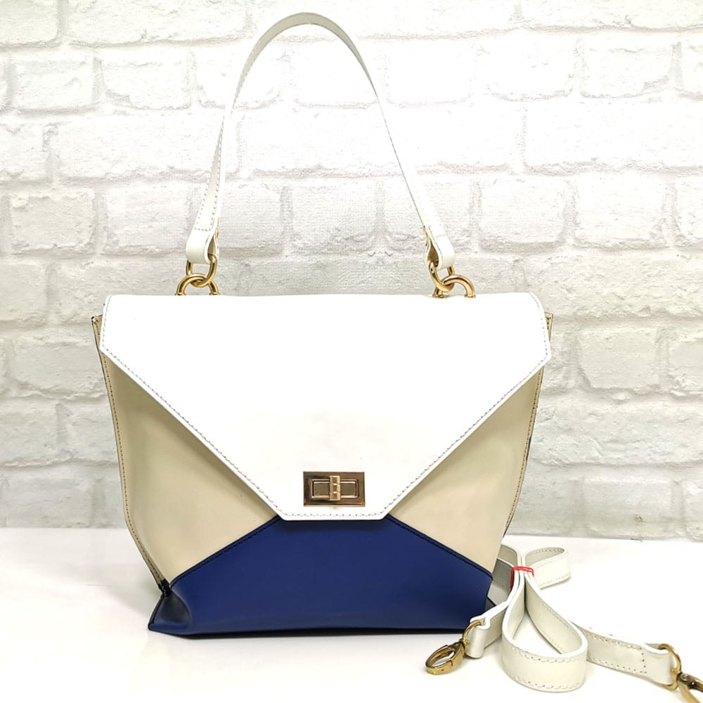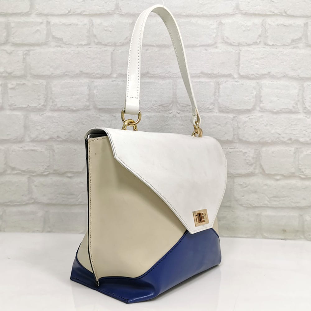 Многоцветна-бяло, екрю, тъмно синьо, дръжки бели, обков златист.