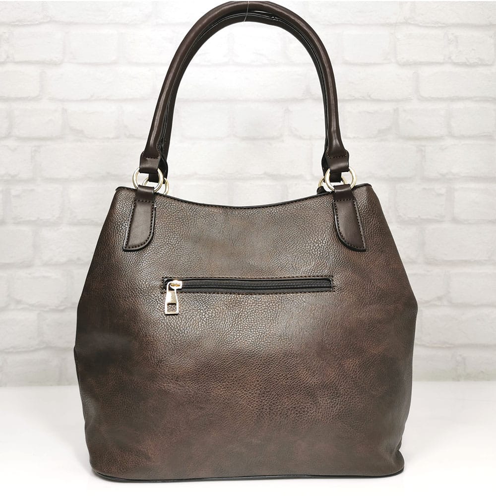 Отвън: на гърба джобче с цип, отпред джоб с метална закопчалка.