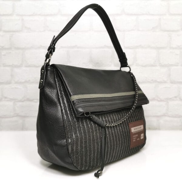 Основен черен меланж, с акценти тъмно кафяво, обков сребрист матиран.