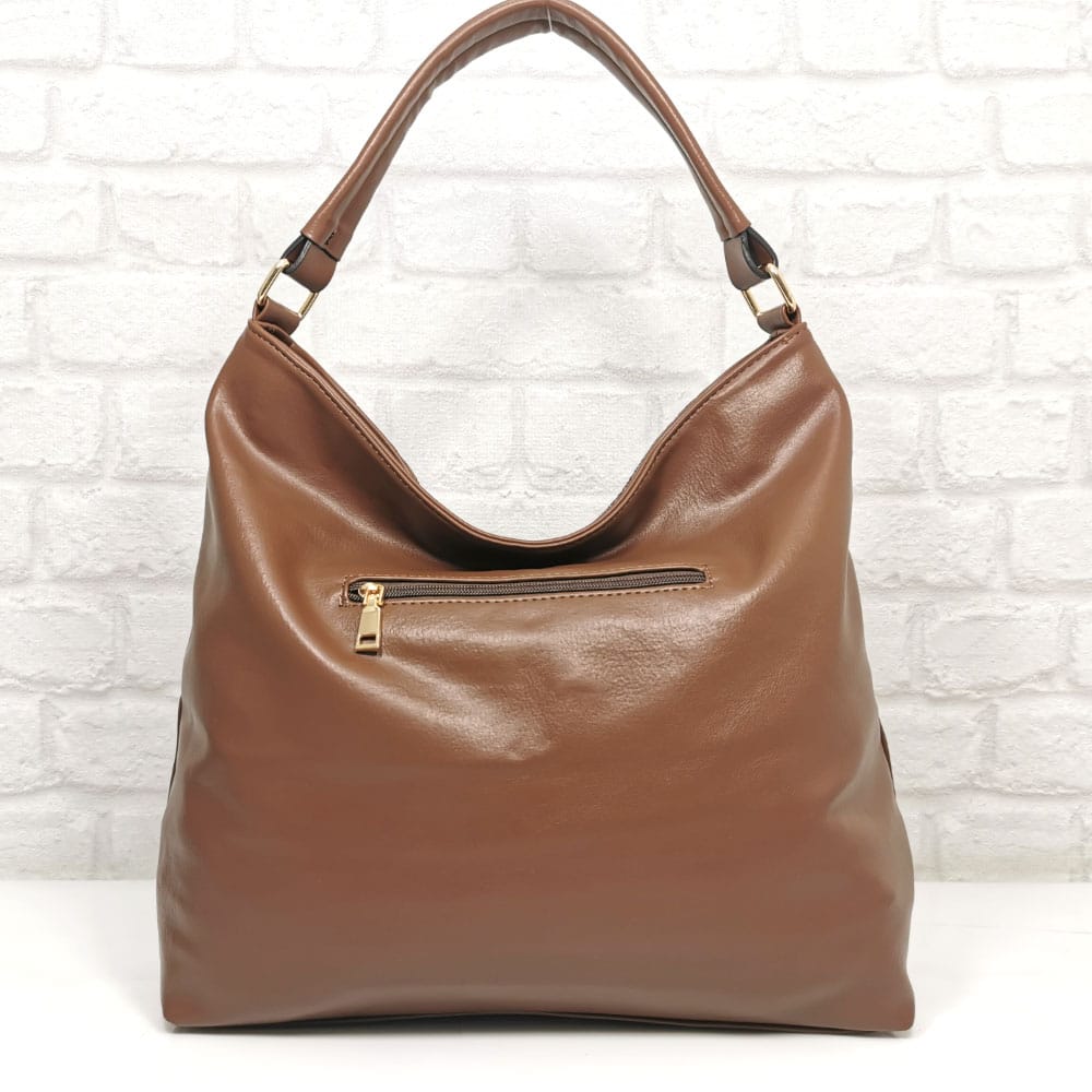 Отвън: отзад на гърба джоб с цип. отпред на лицето джоб със златист метален цип