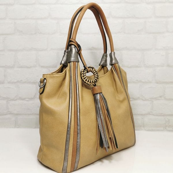 Основен бежов, дръжки бежови, акценти от сребриста кожа, обков сребрист