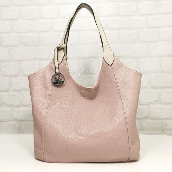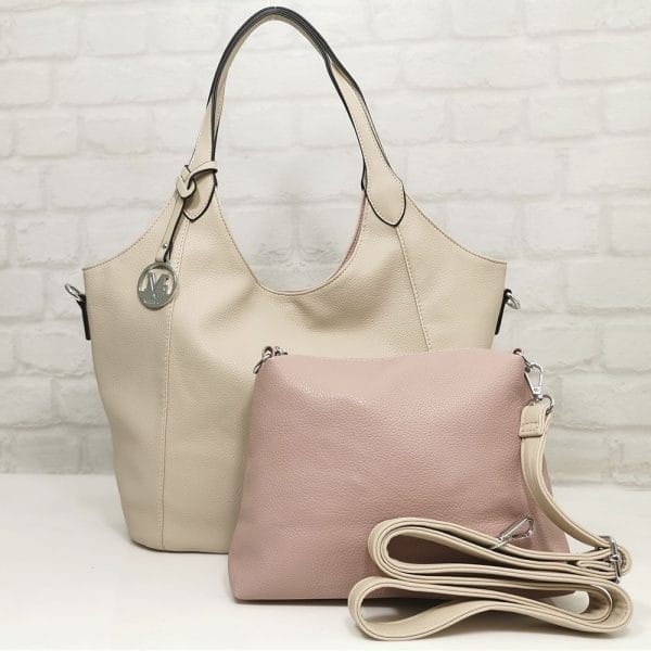 Голямата чанта е двулицева едната страна е екрю, другата е розова. Малката чанта е розова, дръжка екрю
