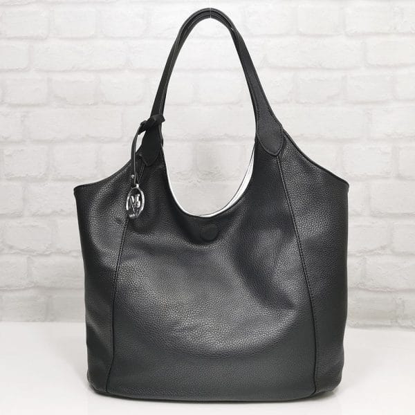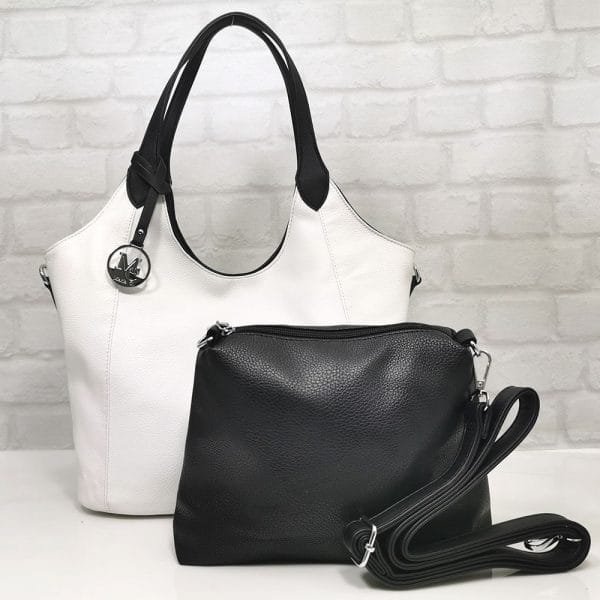 Голямата чанта е двулицева едната страна е бяла, другата е черна. Малката чанта е черна, дръжка черна