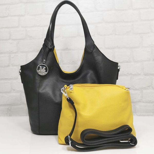 Голямата чанта е двулицева едната страна е черна, другата е жълта. Малката чанта е жълта, дръжка черна