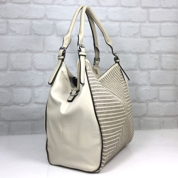Еко кожа, предната част е на ленена основа гарнирана с кожени ивици, хастар-полиестер