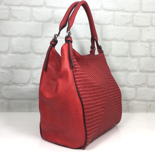 Еко кожа, предната част е на ленена основа гарнирана с кожени ивици, хастар-полиестер