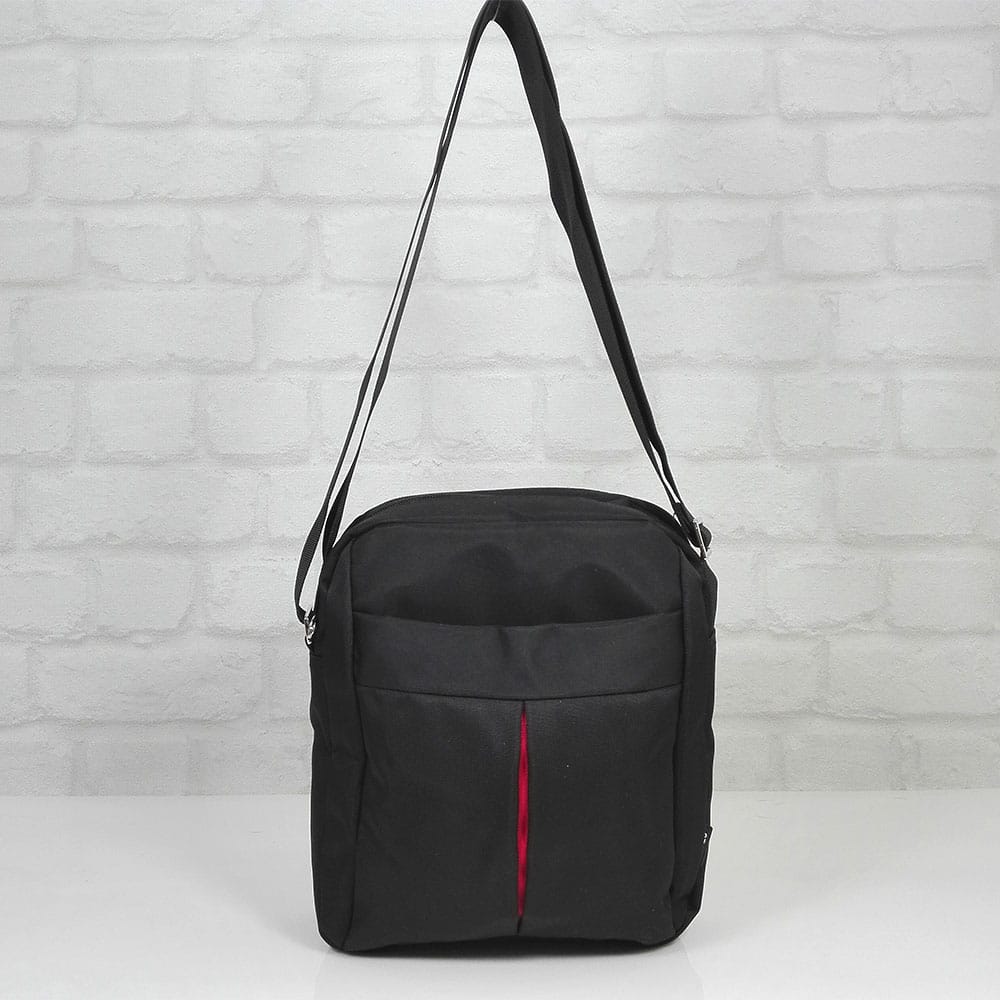 Черен с тънка червена лентичка отпред на джоба