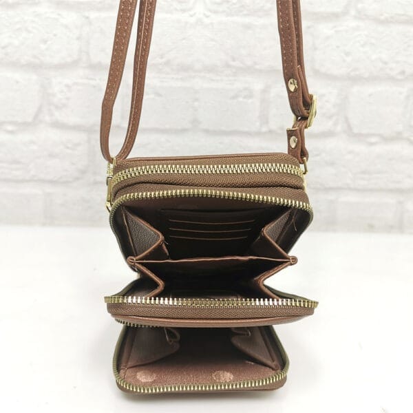 Вътре: общо 5 прегради, разпределени в три джоба, 9 процепа за карти, като единият е прозрачен