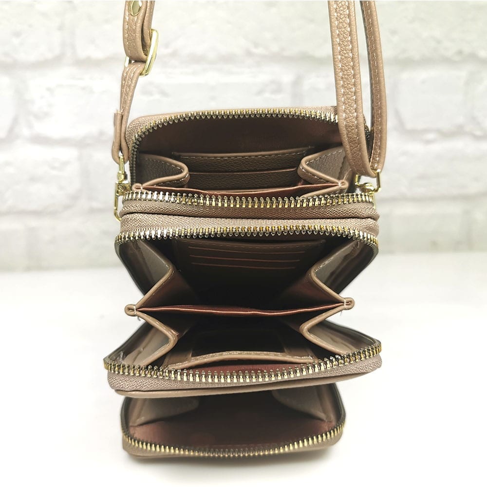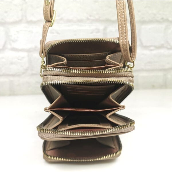 Вътре: общо 5 прегради, разпределени в три джоба, 9 процепа за карти, като единият е прозрачен