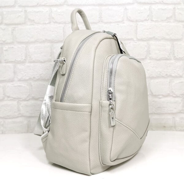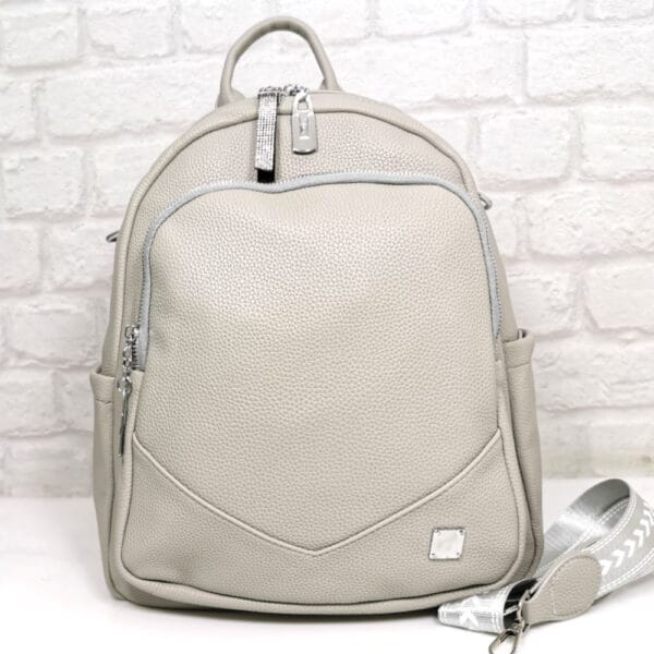 Две регулиращи се дръжки, комбинация от еко кожа и текстилна лента, една подвижна текстилна дръжка дълга 70 см. и широка 4 см. с която можете да носите раницата и като чанта на едно рамо, една къса дръжка.