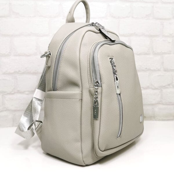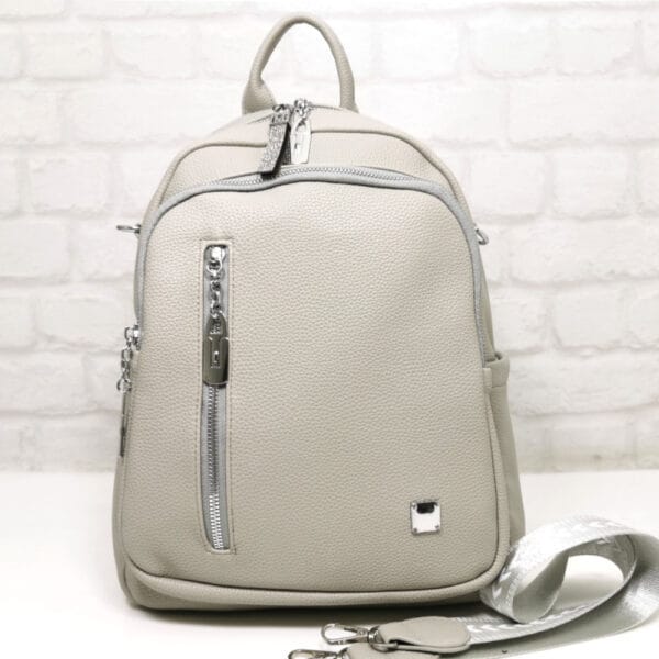 Две регулиращи се дръжки, комбинация от еко кожа и текстилна лента, една подвижна текстилна дръжка дълга 70 см. и широка 4 см. с която можете да носите раницата и като чанта на едно рамо, една къса дръжка.