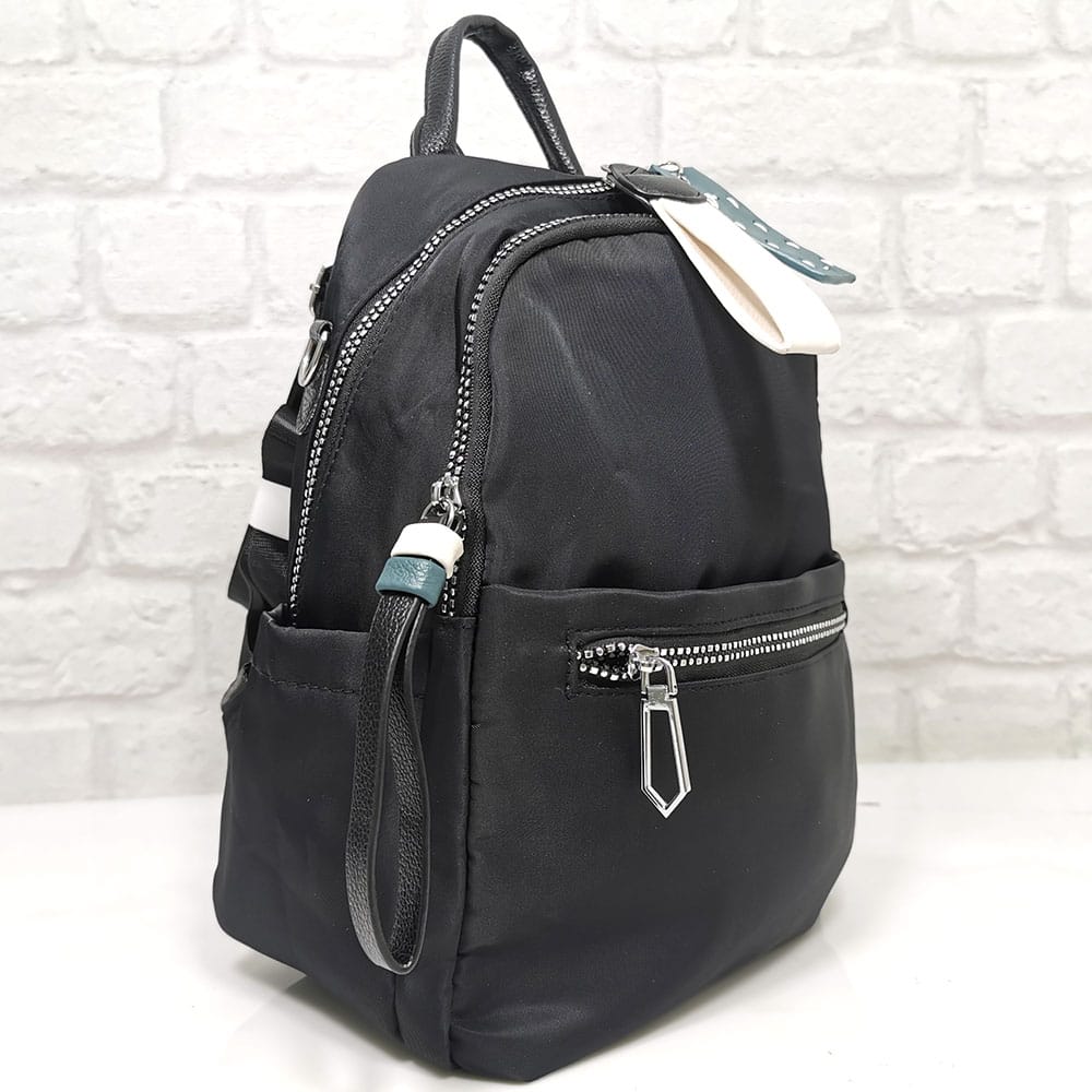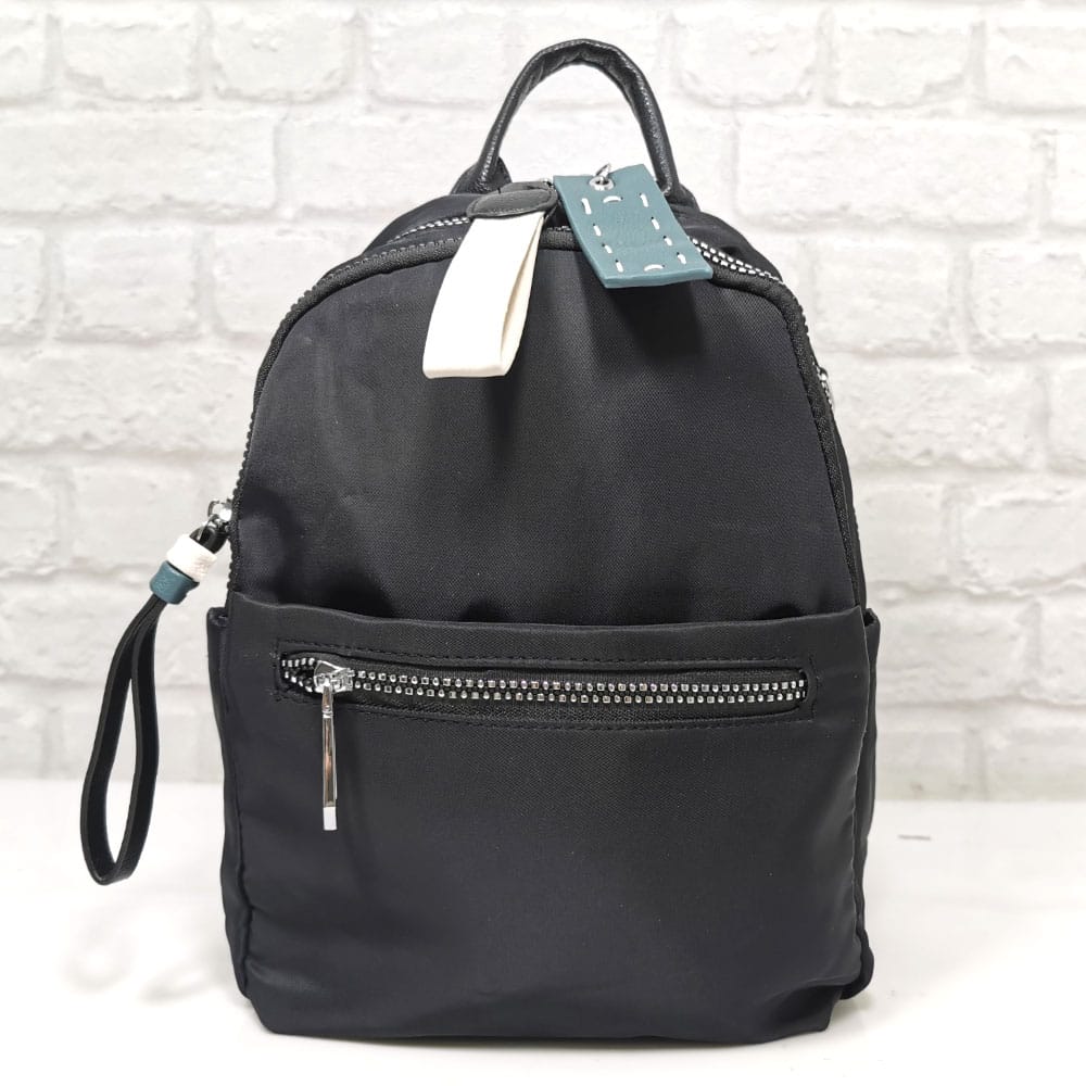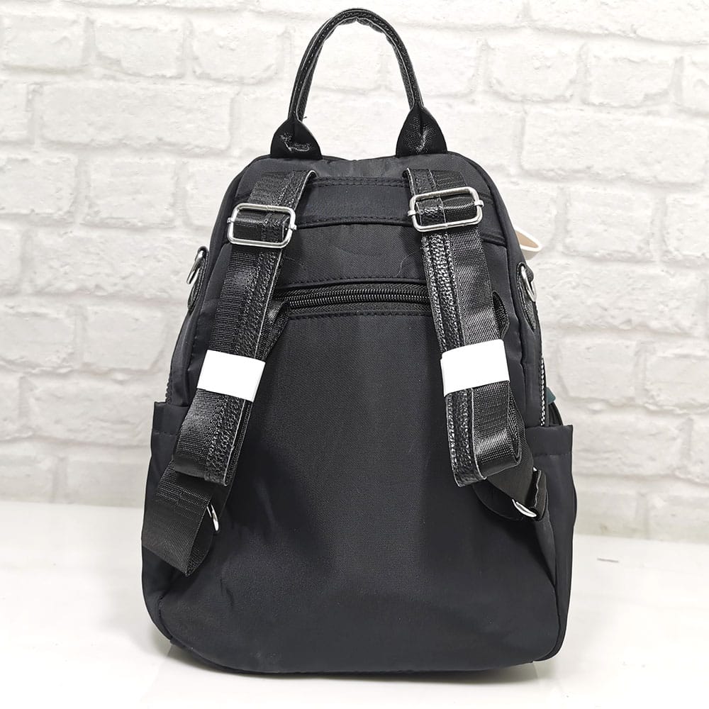 Отвън: Две отделни прегради с метални ципове, два малки джоба с ципове, две странични джобчета без закопчаване , на гърба джоб с обикновен цип