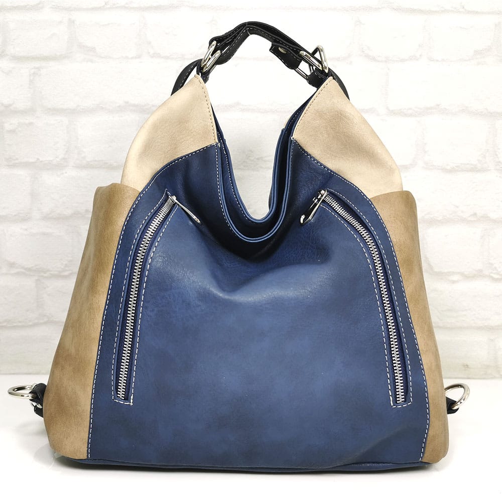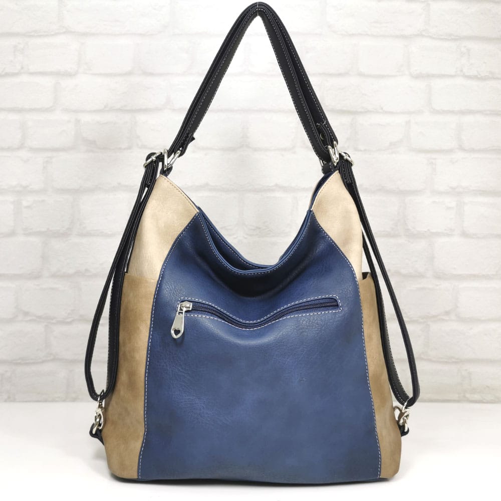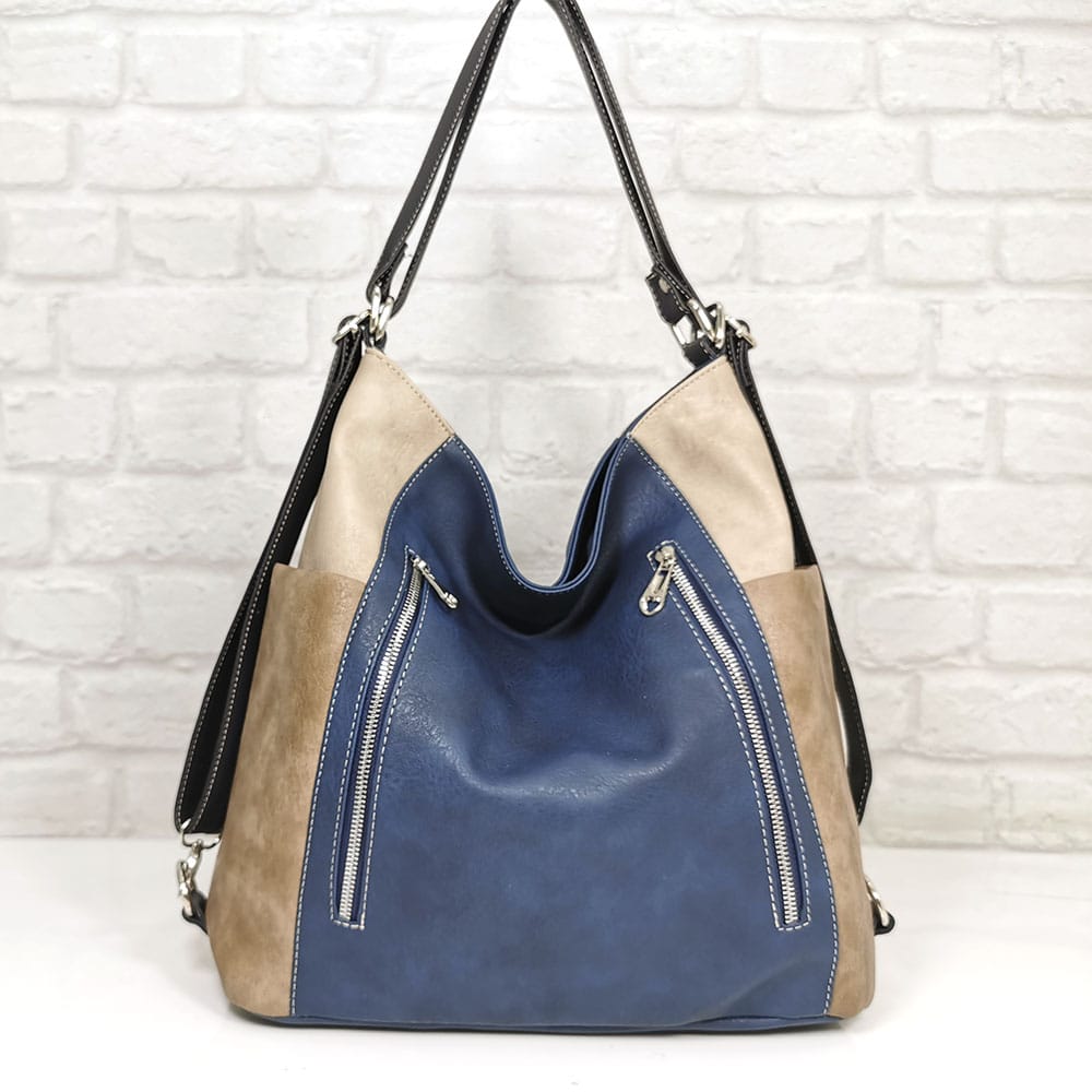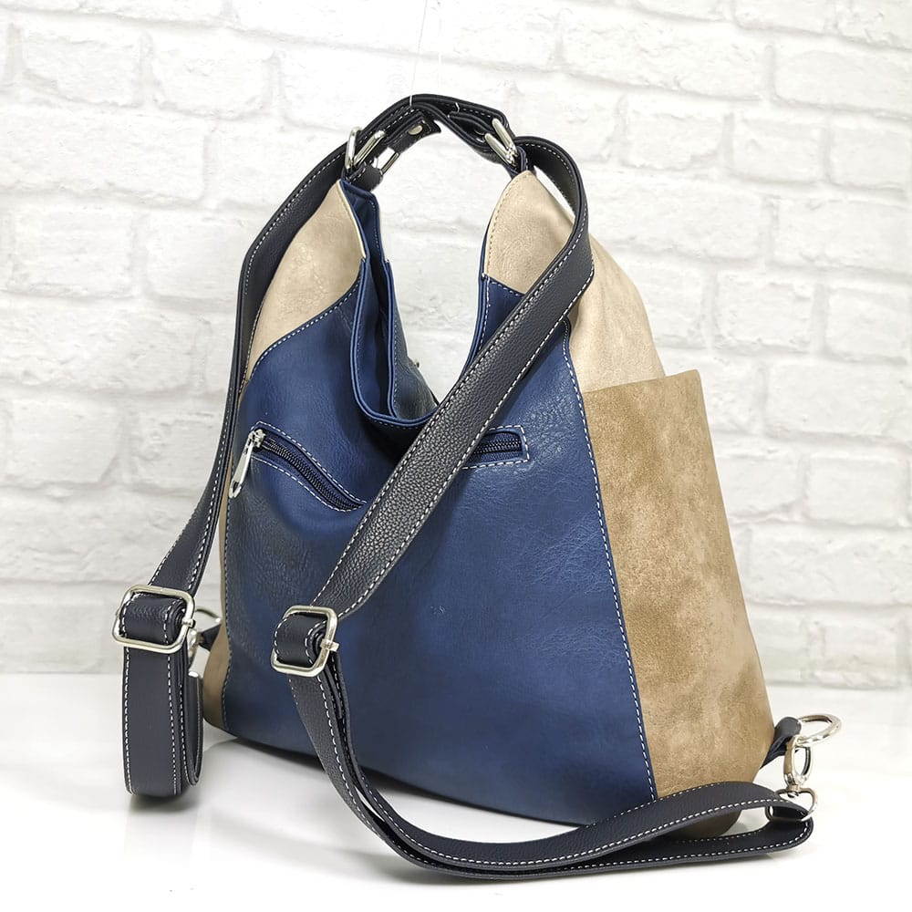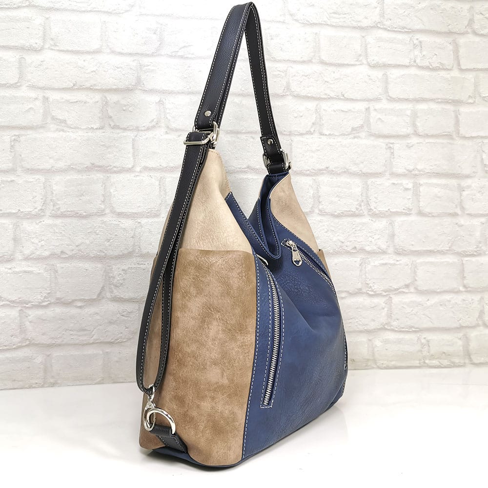 Основен син, комбиниран с два нюанса на бежовото и с черни дръжки, обков сребрист