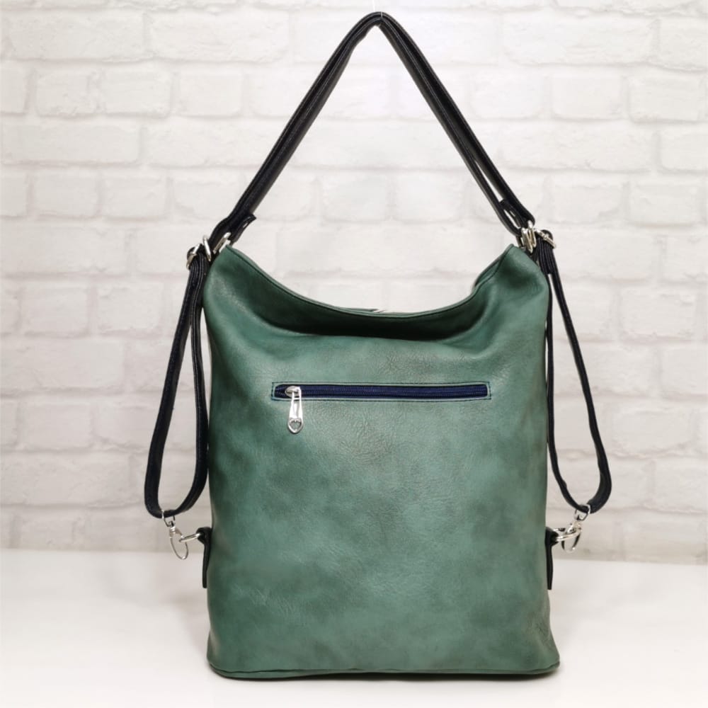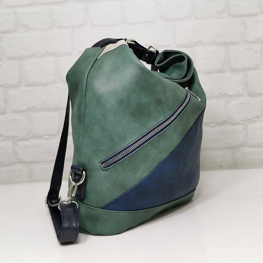 Отвън: на гърба джобче с цип, отпред диагонално разположен джоб с метален цип.