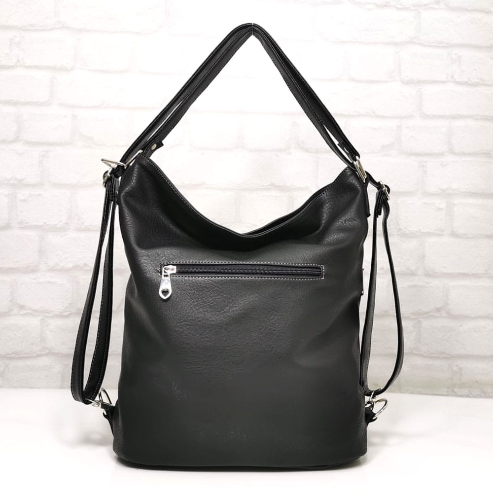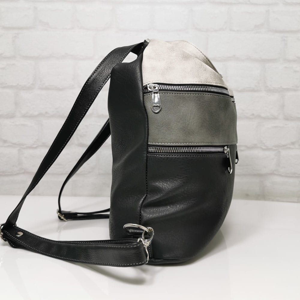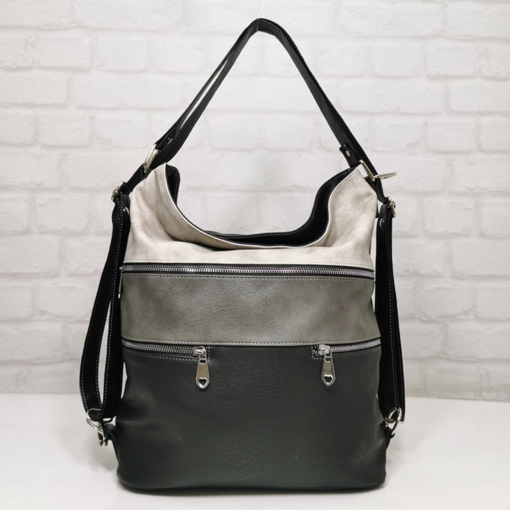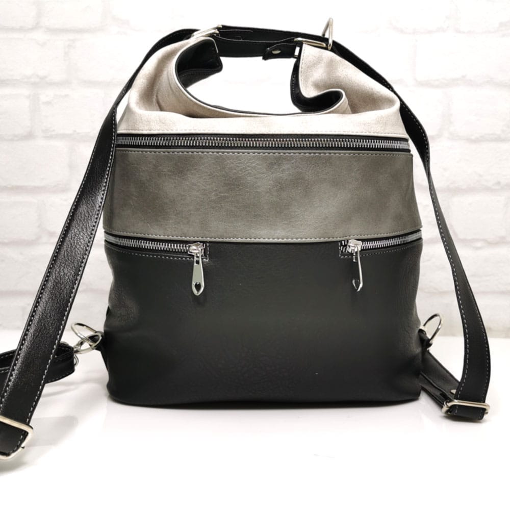 Отвън: на гърба джобче с цип, отпред голям джоб с метален цип и два малки джоба с метални ципове.