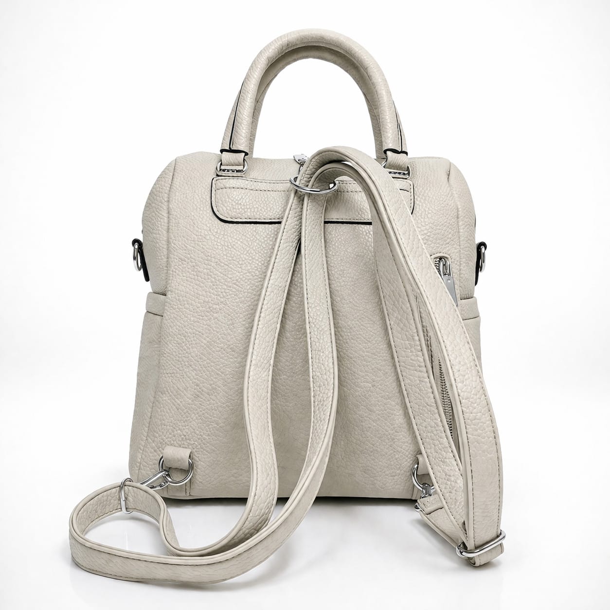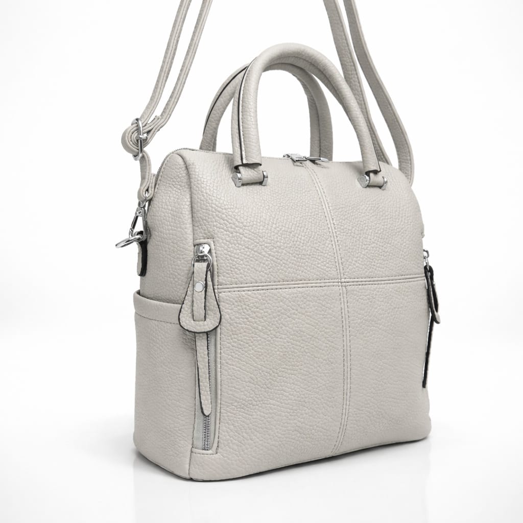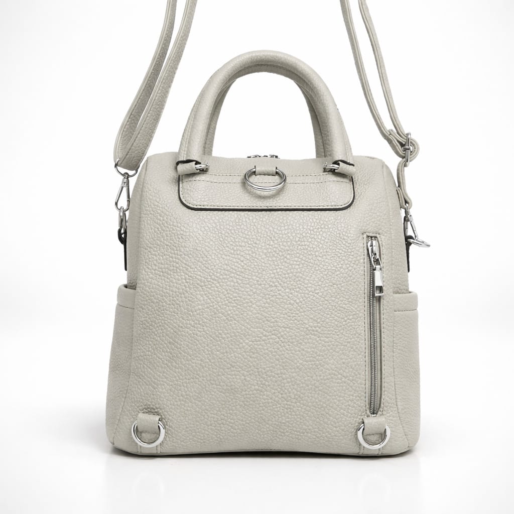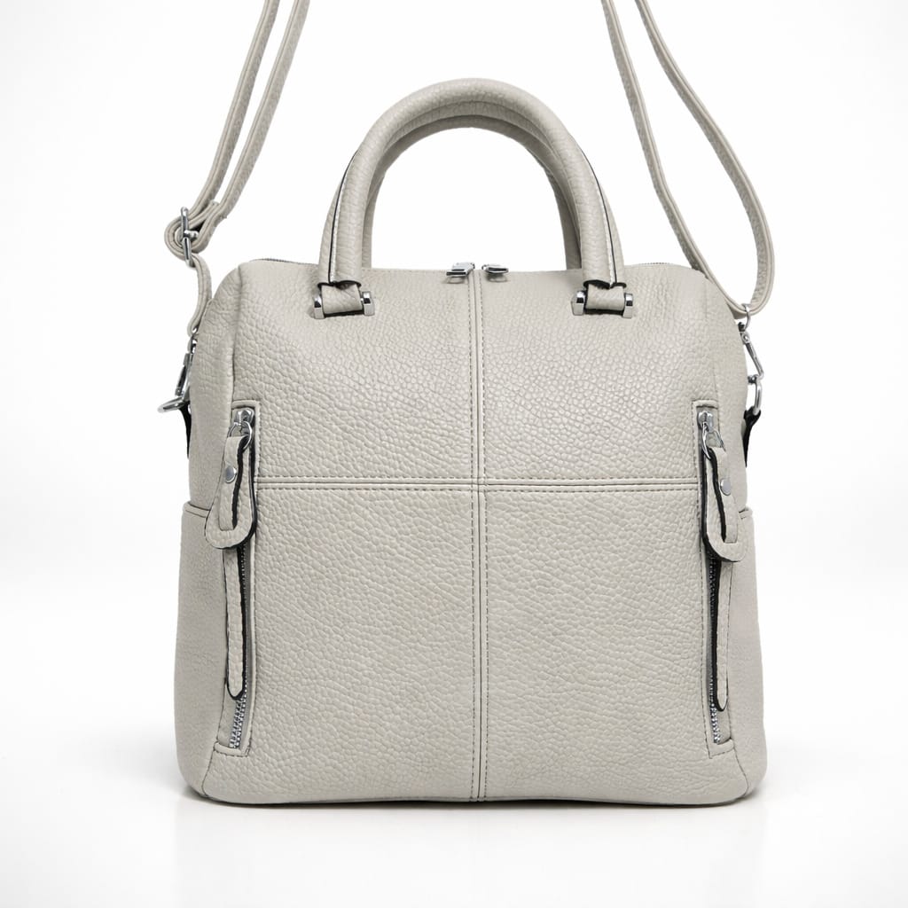 Чанта-раница в светло сиво с дълга презрамка- стилно решение за модерната жена в движение. Практичният дизайн позволява носене както в стил крос боди, така и като раница за максимално удобство. Чантата разполага с функционални джобове и ципове за добра организация. Светлият цвят и изчистената визия я правят подходяща както за ежедневие, така и за по-елегантни поводи.