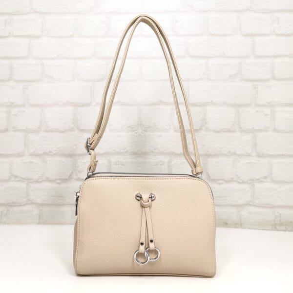 Светло бежов, обков метален, сребрист.