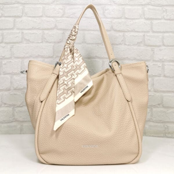Светло бежов, шалче екрю с бежово, обков метален, сребрист.