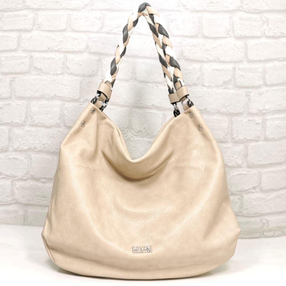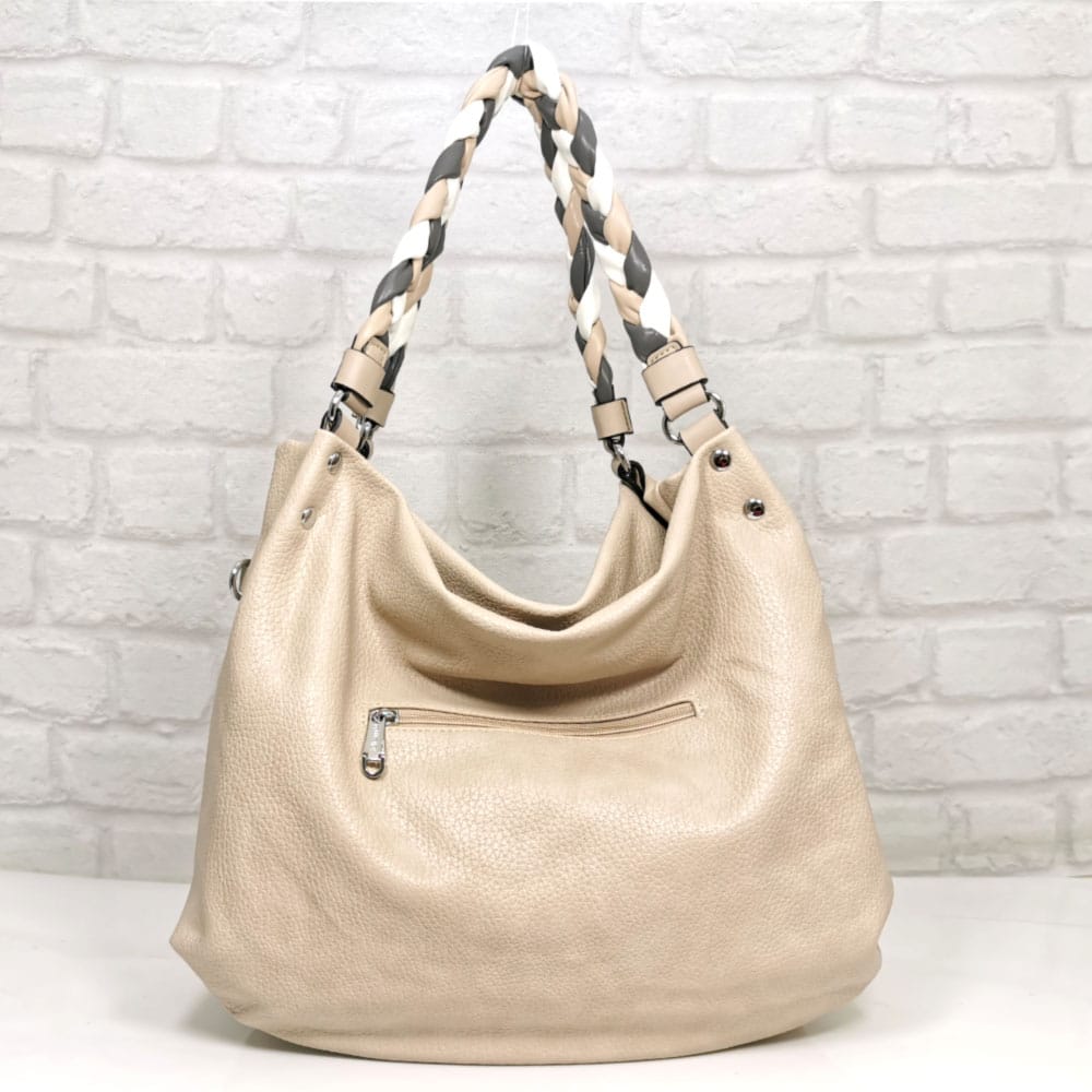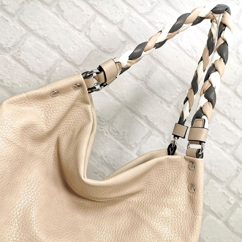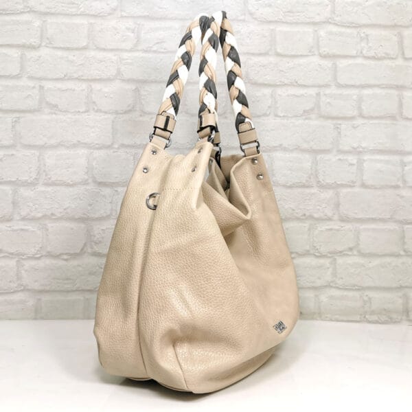 Светло бежов, дръжка плетеница от бяло, бежово и тъмно сиво, обков метален, сребрист.