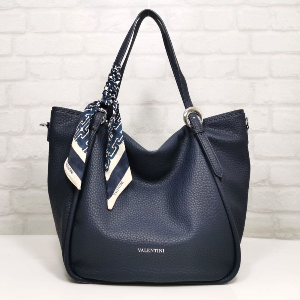 Тъмно син, шалче бяло със синьо и сиво, обков метален, сребрист.
