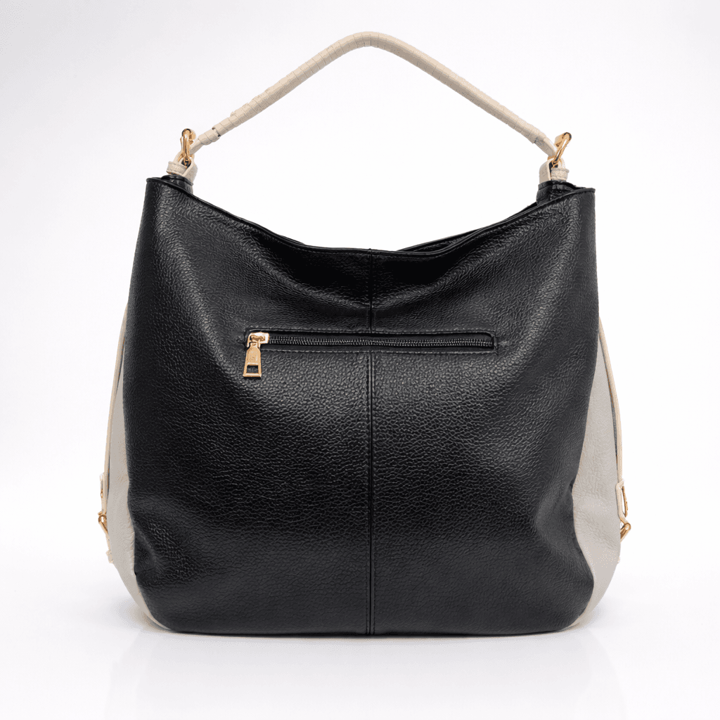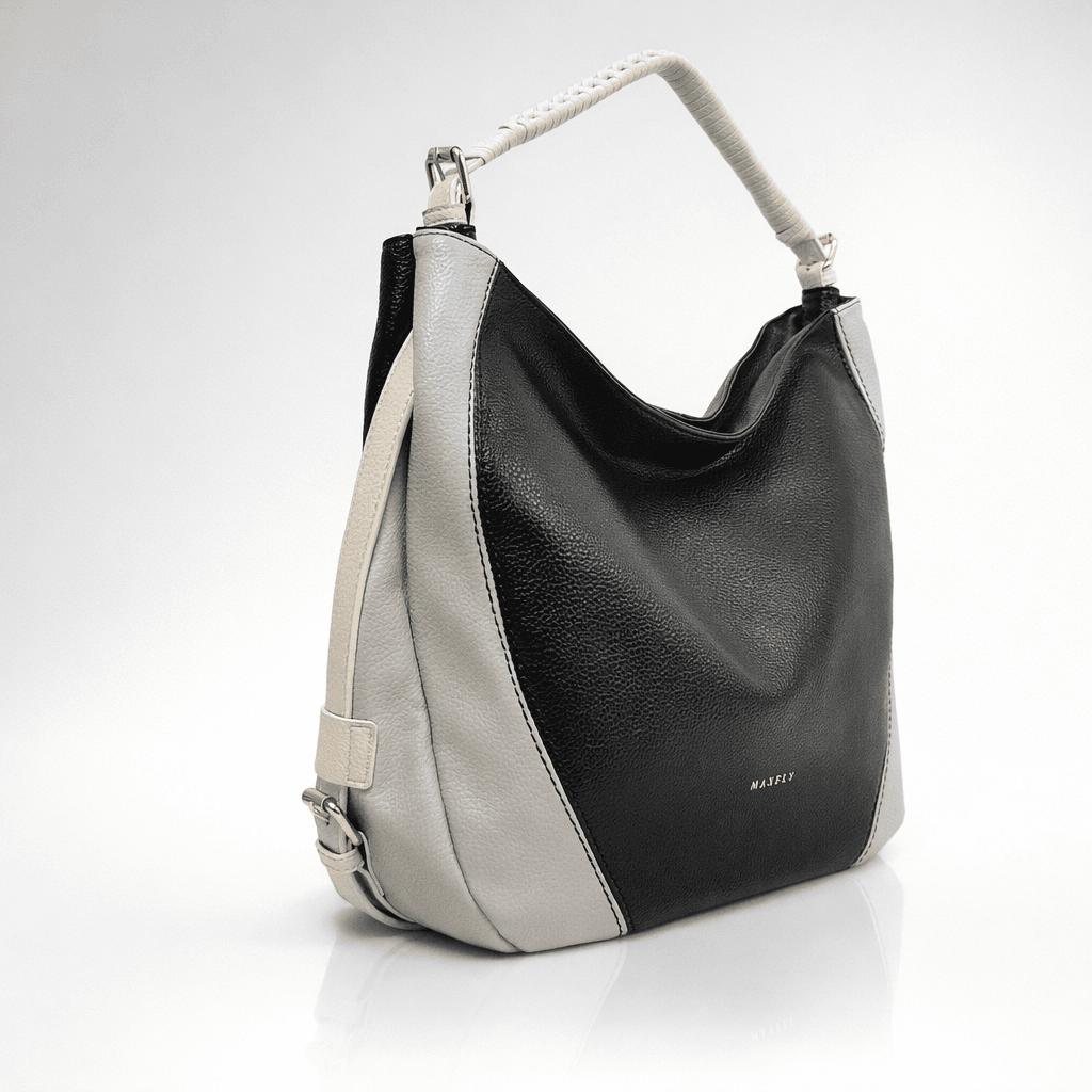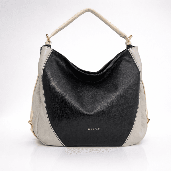 Чанта тип хобо с плетена дръжка и универсална комбинация от черно, екрю и светло сиво. Изработена от висококачествена еко кожа с мека структура и удобна за носене на рамо регулираща се дръжка. Просторна и практична за ежедневие, офис или излизане в града.