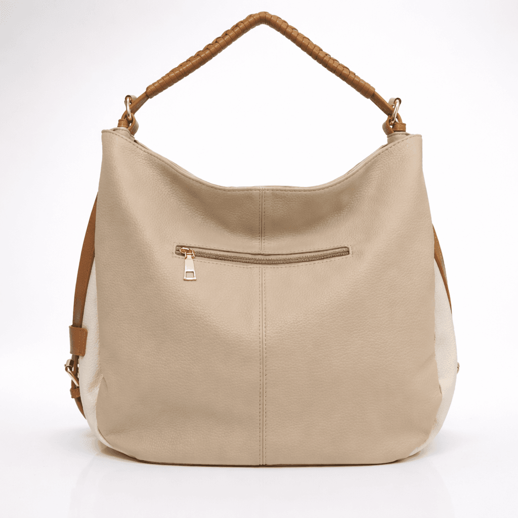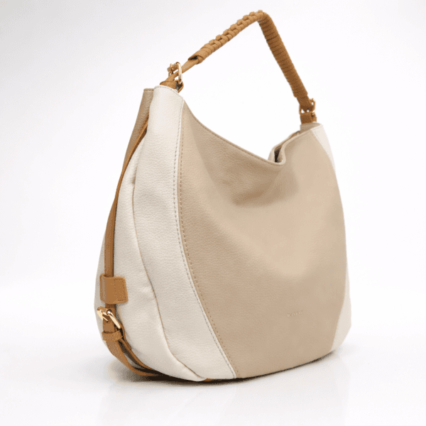 Чанта тип хобо в бежова гама изработена от висококачествена еко кожа с мека структура и удобна за носене на рамо регулираща се дръжка. Просторна и практична за ежедневие, офис или излизане в града.
