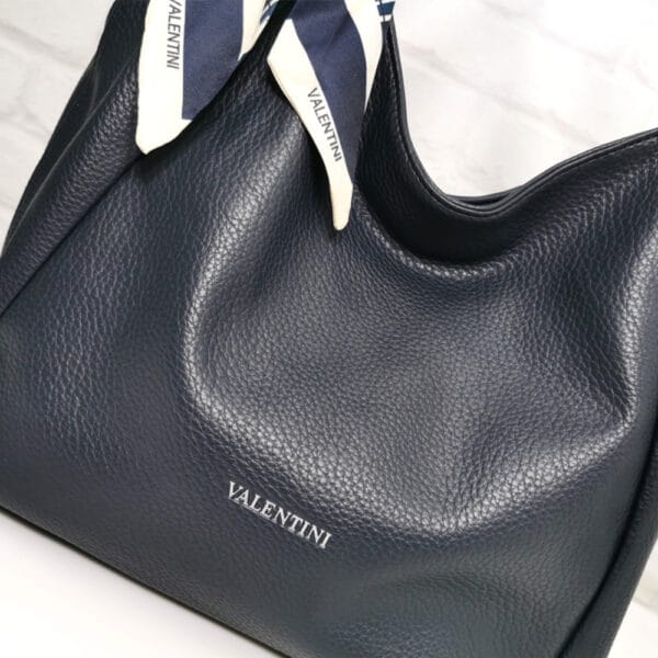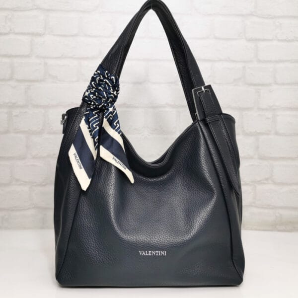 Тъмно син, шалче бяло със синьо и сиво, обков метален, сребрист.