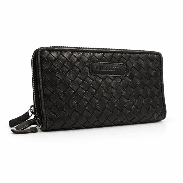 Черно кожено портмоне с двоен цип с модерна плетена текстура с много джобчета за карти, документи и пари.