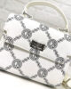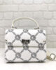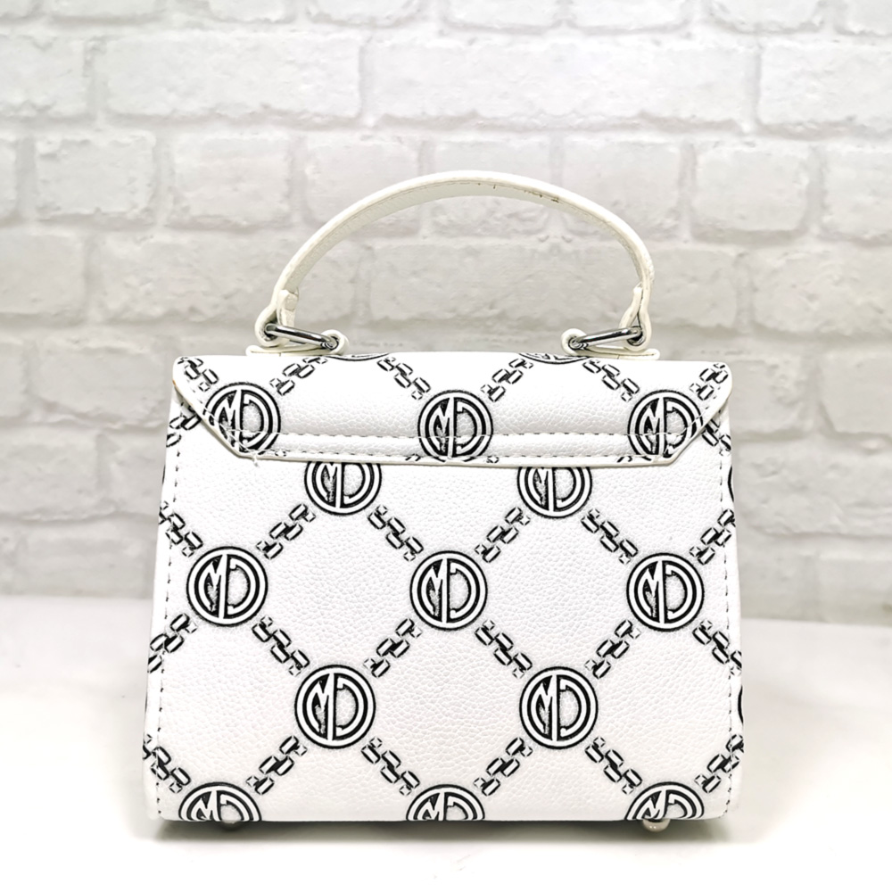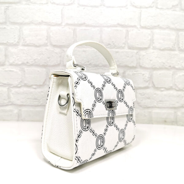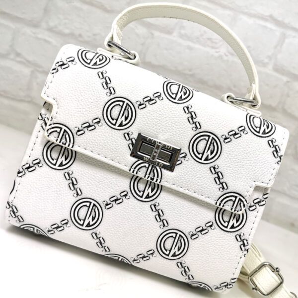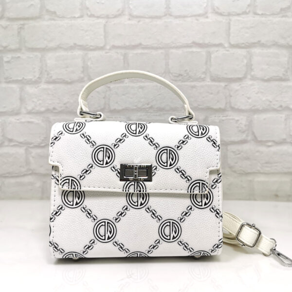 Красива малка дамска чанта, брандирана с контрастна щампа. Има къса и дълга реголируема дръжка от еко кожа. Перфектна както за стилна ежедневна визия, така и за специални поводи.