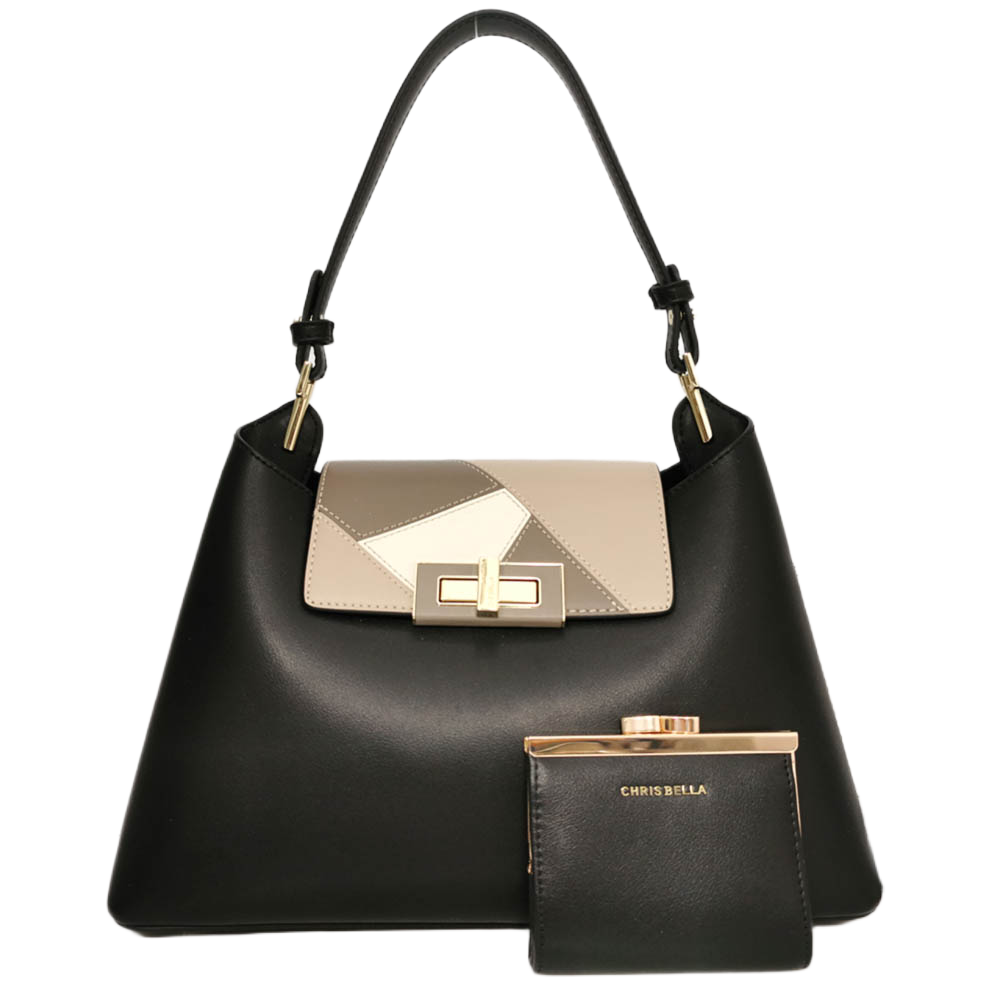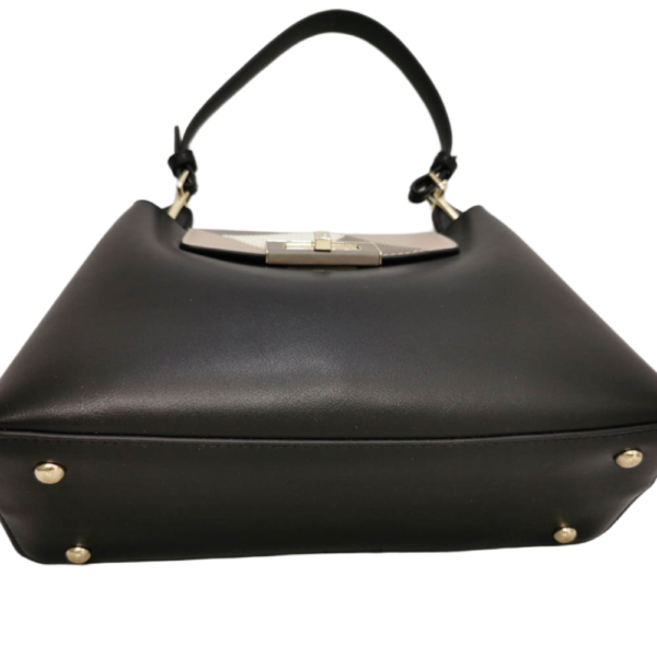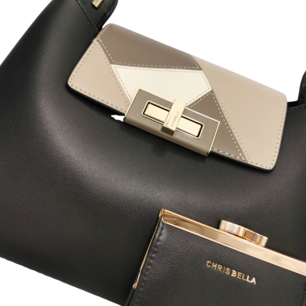 Чантата е с три прегради, като средната се закопчава с метален златист цип, а двете странични са без закопчаване, капачето е метална врътка, портмонето е с метална лайсна в златисто.