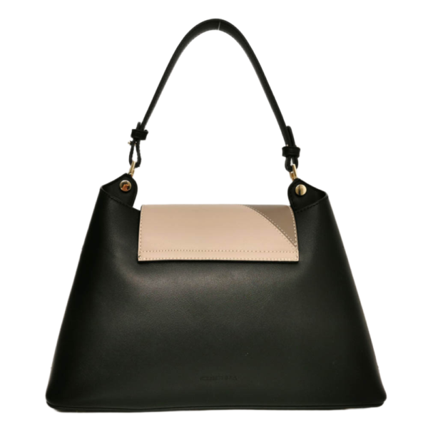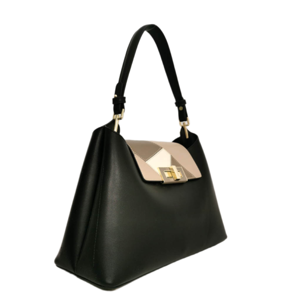 Черен, комбиниран с декорация в бежово и бяло, обков метален златист.