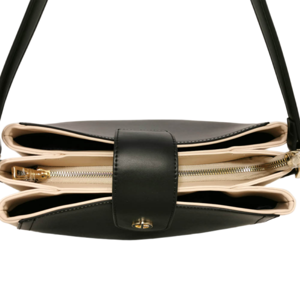 Чантата е с три прегради, като средната се закопчава с метален златист цип, а двете странични са с магнитни копчета, капачето е с магнитно копче,  портмонето е с метална лайсна в златисто.