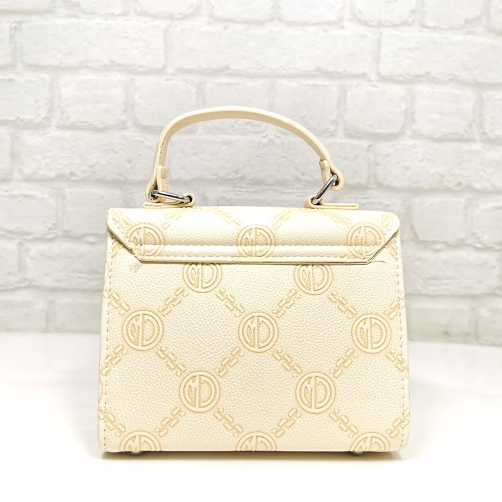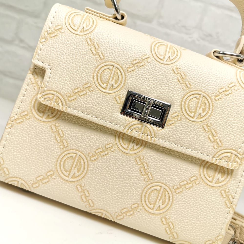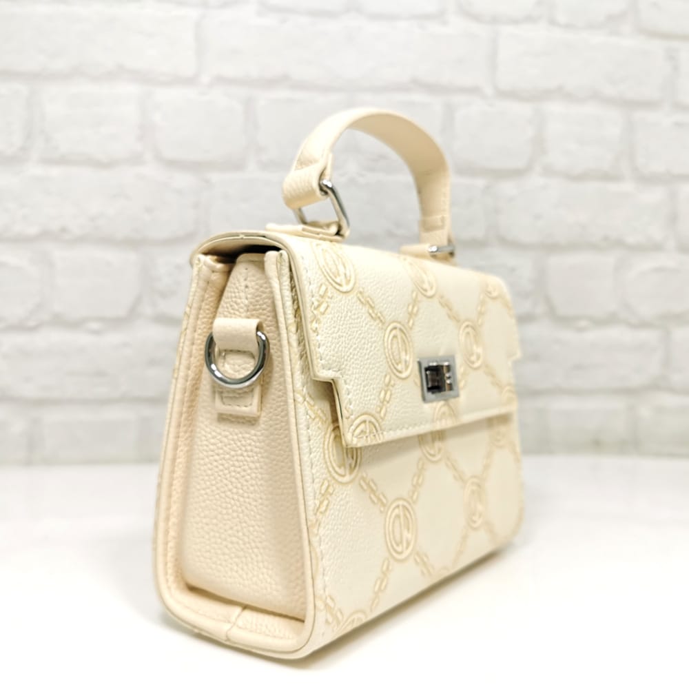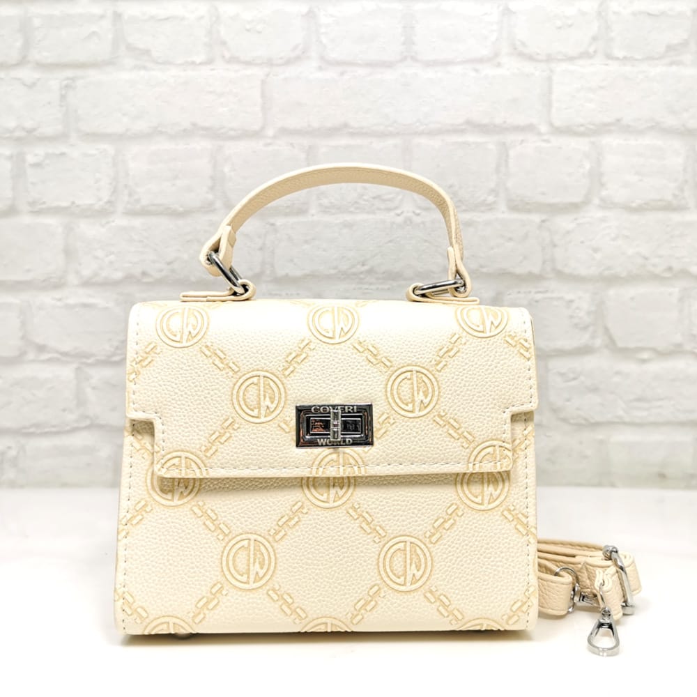 Красива малка дамска чанта, брандирана с контрастна щампа. Има къса и дълга реголируема дръжка от еко кожа. Перфектна както за стилна ежедневна визия, така и за специални поводи.