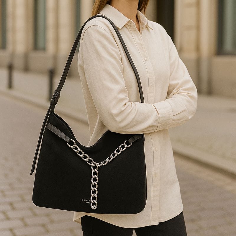 Модерна дамска чанта през рамо изработена от еко кожа и еко велур. Отличава се с ефектна лека метална верига отпред, която придава стил и характер на визията. Чантата е с регулируема дръжка, просторен вътрешен джоб и сигурно закопчаване с цип, което я прави едновременно практична и елегантна. Подходяща е за ежедневието и вечерни излизания. Оригинален дизайн на марката „David Jones“- Франция. Всички стоки са с преглед и тест! Безплатна доставка за заявки над 80.00лв./40.90€ до офис на транспортна фирма!