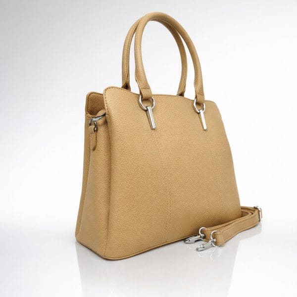 Изработена от еко кожа с релефна текстура, моделът впечатлява с изчистена линия, стабилна форма и метални акценти в сребрист тон. Дръжките са удобни за носене в ръка, а включената дълга регулируема дръжка позволява носене през рамо.