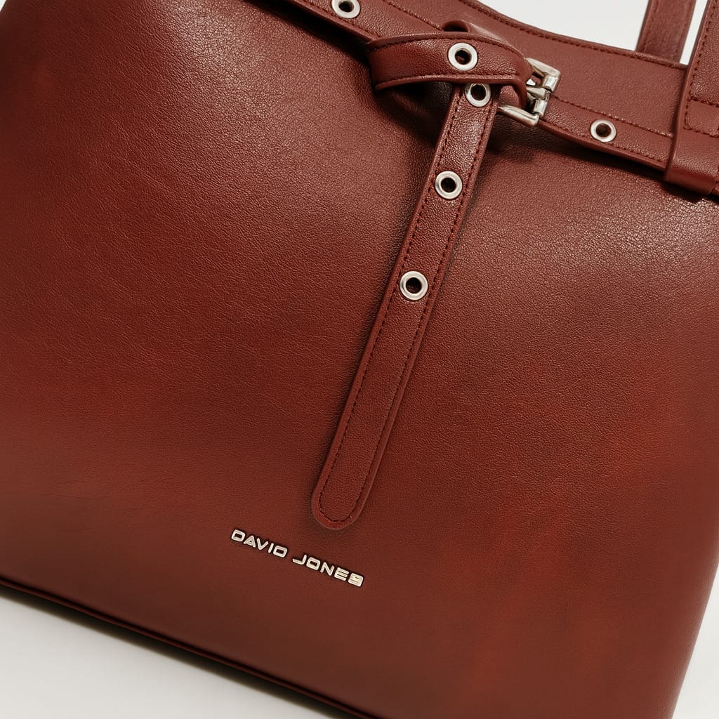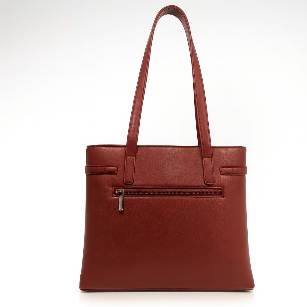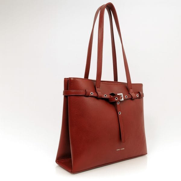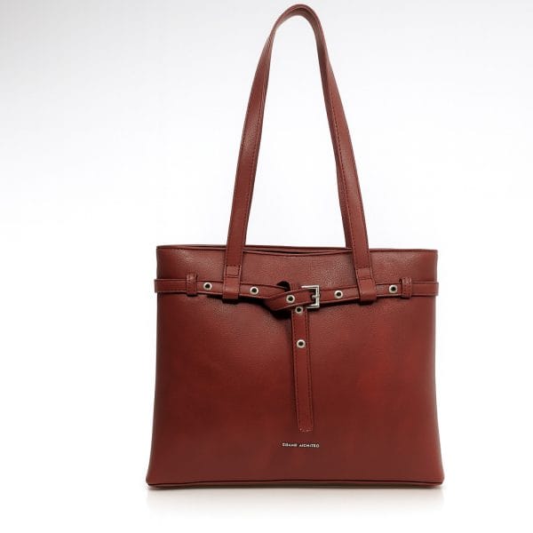 Тази дамска чанта еко кожа в цвят бордо съчетава финес, излъчване и модерна визия. Декоративният колан с метални капси добавя модерен акцент към изчистения силует. Задният джоб с цип е идеален за бърз достъп до най-важните вещи. Вътрешното пространство е добре организирано, има две отделни прегради и два малки джоба- за документи и телефон, така че всичко да си има място. Двете стабилни дръжки са достатъчно дълги и осигуряват комфорт при носене на рамо през целия ден.