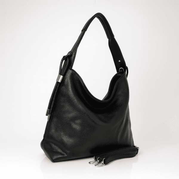 Тази дамска чанта от еко кожа в класически черен цвят е създадена за жени, които ценят свободата и комфорта в ежедневието си. Мекият, леко падащ силует прегръща формата на рамото, а изчистеният дизайн лесно се комбинира както с градски, така и с по-елегантни визии.
