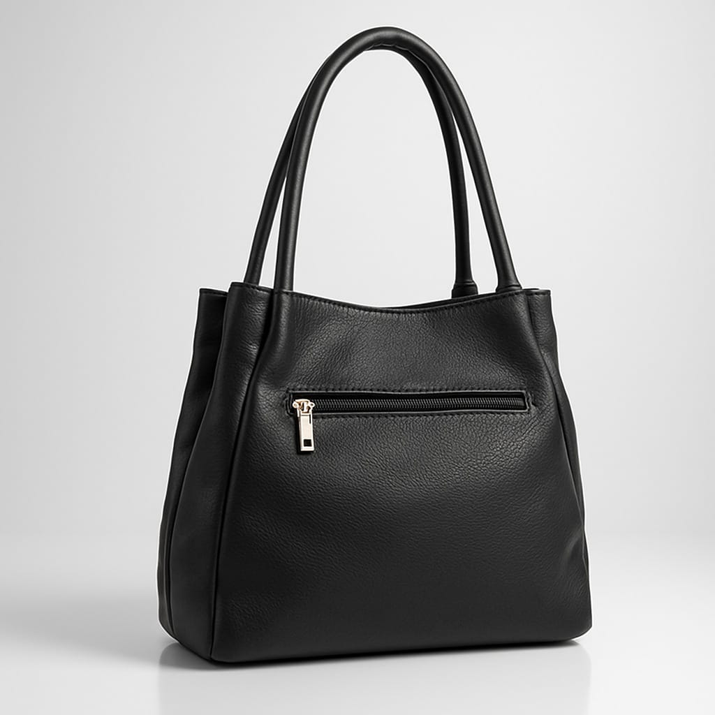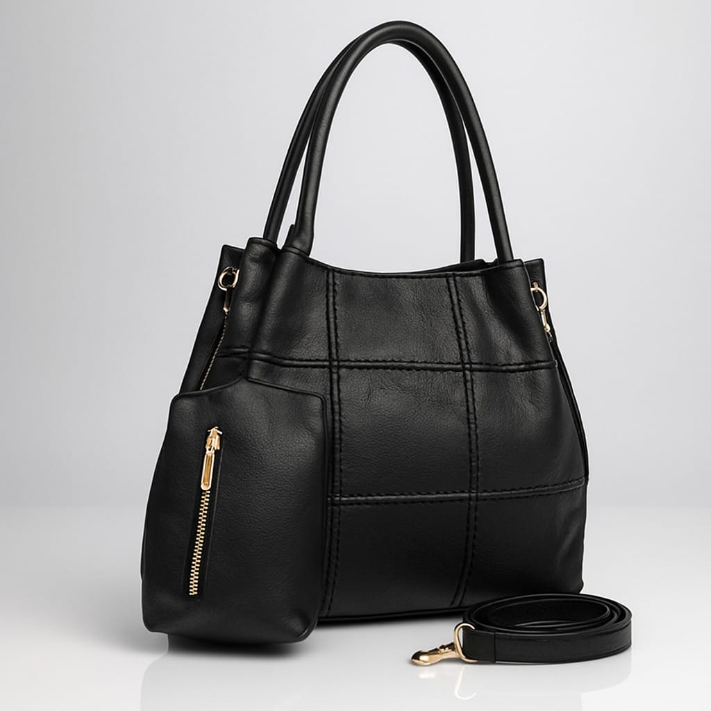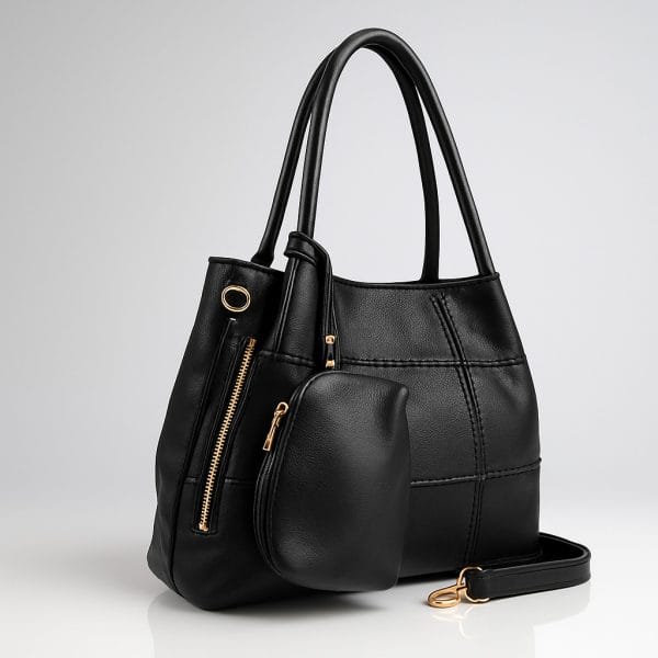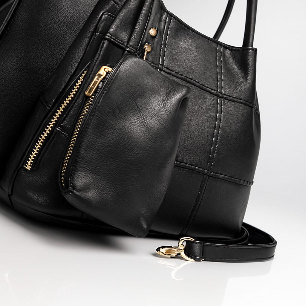 Тази дамска чанта от еко кожа е създадена за динамичното ежедневие – достатъчно просторна за документи, портмоне и малки аксесоари, но запазва елегантен силует. Класическият черен цвят се съчетава лесно с различни стилове, а фината релефна текстура и декоративните шевове отпред придават усещане за модерен дизайн. Златистите метални елементи и ципове внасят леко луксозно излъчване, а отделната малка чантичка е практично място за ключове, карти или слушалки. Има разширител с ципове.