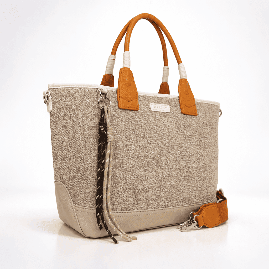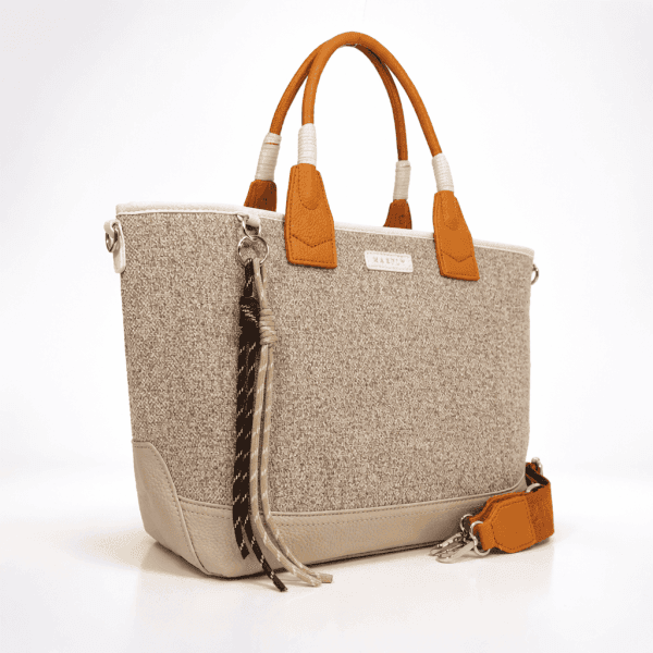 Тази дамска чанта от еко кожа впечатлява с баланса между мек, естествен нюанс и модерно градско излъчване. Бежовата текстура стои изискано и лесно се комбинира както с ежедневни, така и с по-елегантни визии, а контрастните къси дръжки добавят топъл акцент и характер.